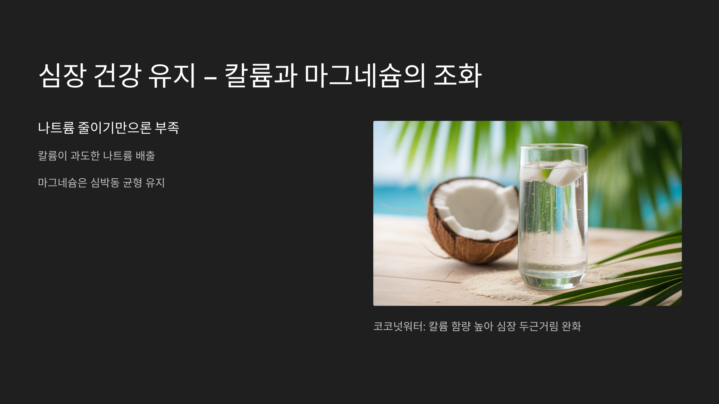 > 개인 경험: 제가 심장 두근거림으로 고민하던 시절, 하루 한 컵 **코코넛워터**를 꾸준히 마시며 증상이 완화됐습니다. 칼륨 함량이 매우 높습니다.