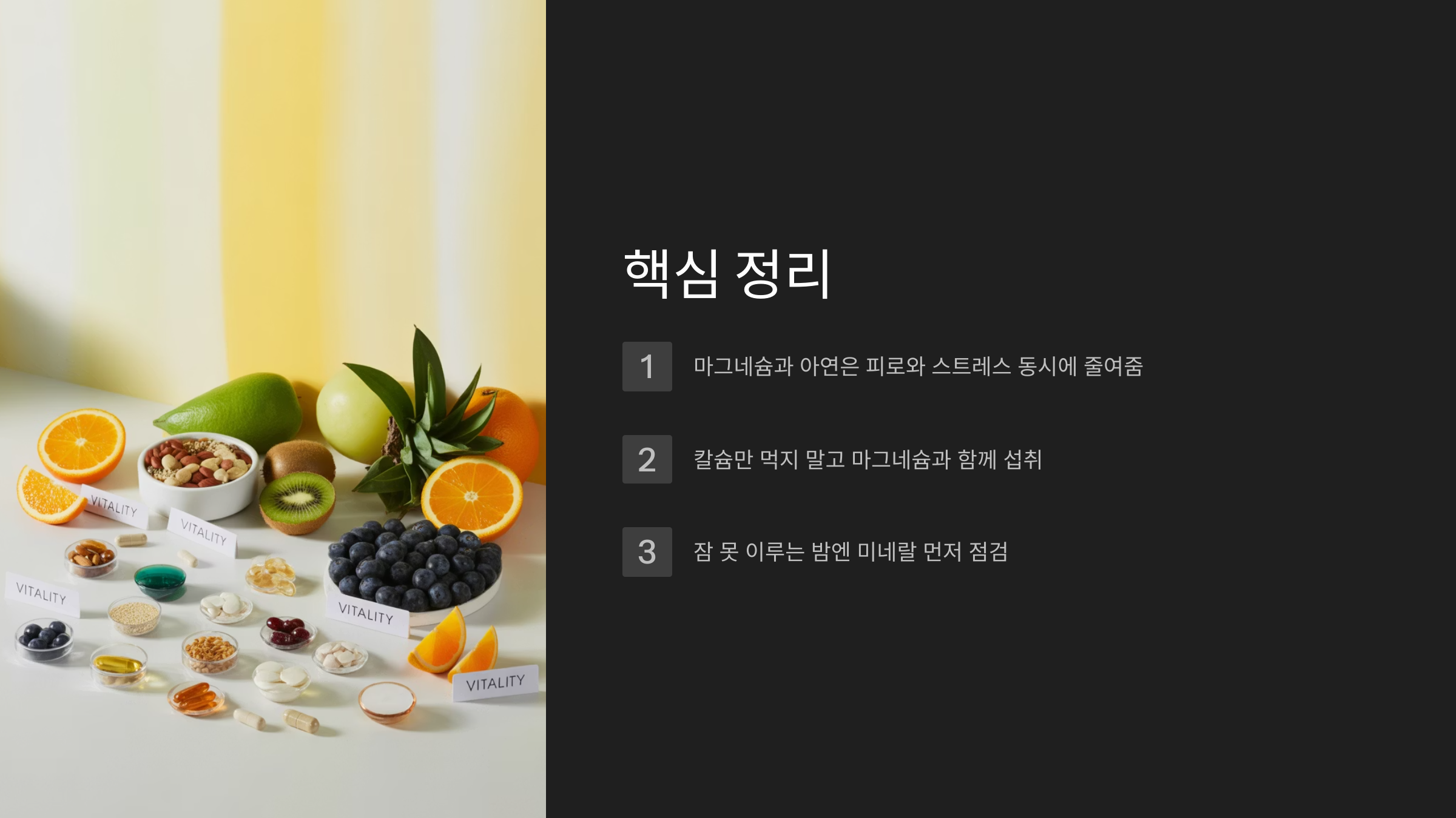> TIP: **취침 1시간 전, 마그네슘 마시기 + 조용한 스트레칭** → 수면 유도율 20% 향상 (미국수면협회 발표)