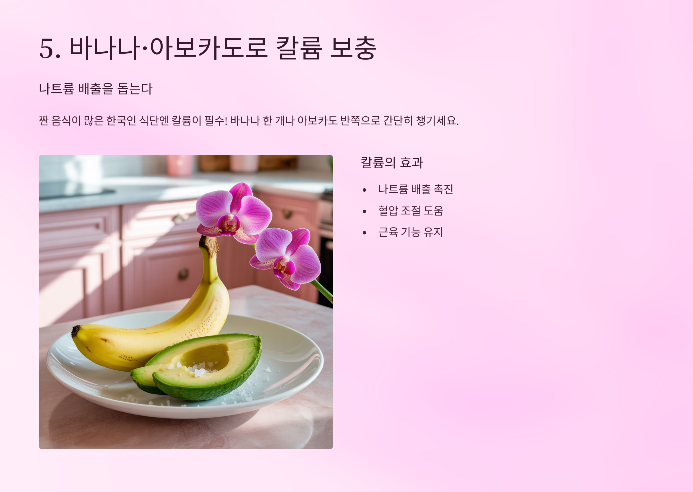 짠 음식이 많은 한국인 식단엔 칼륨이 필수! 바나나 한 개나 아보카도 반쪽으로 간단히 챙기세요.