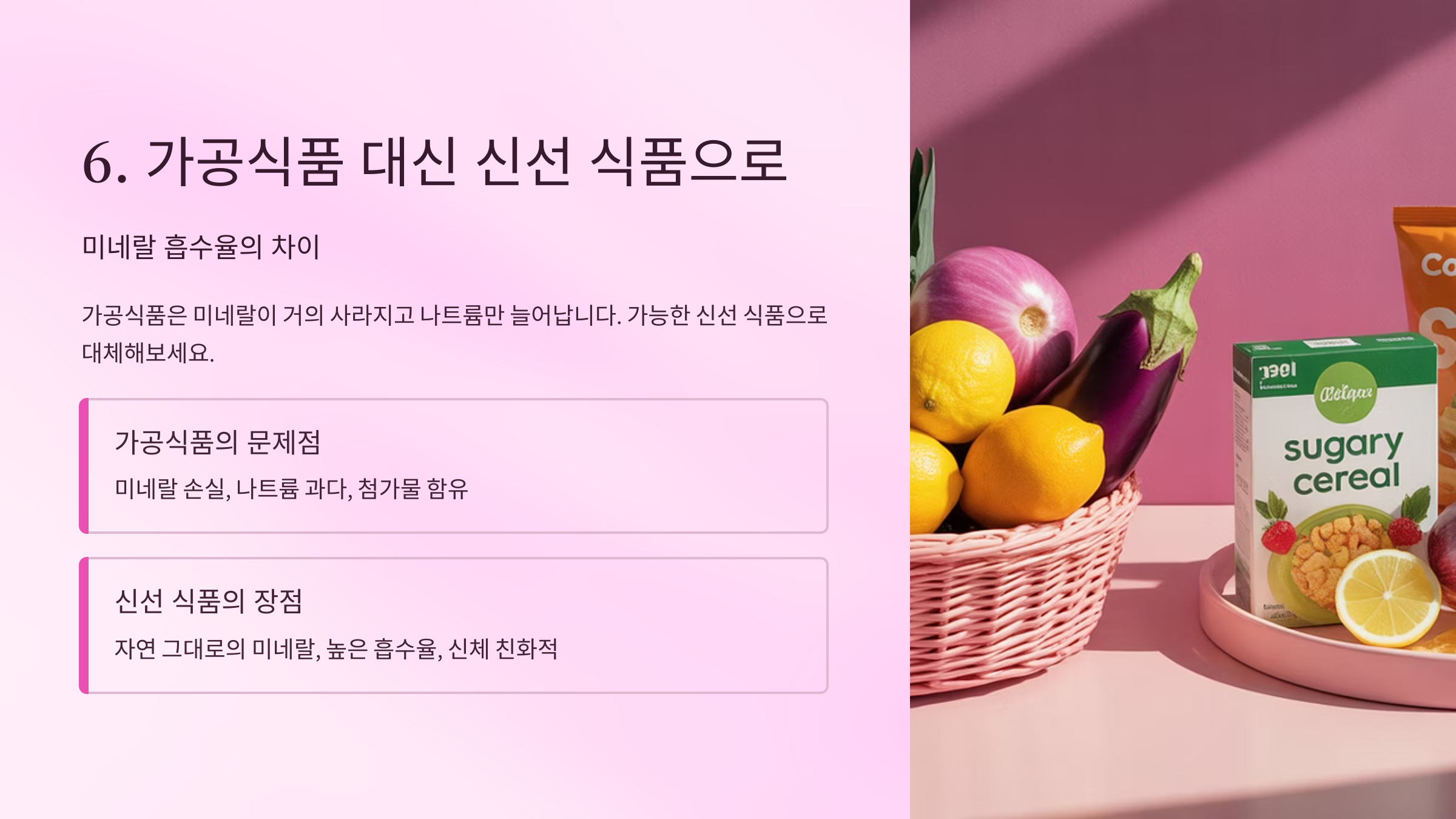 가공식품은 미네랄이 거의 사라지고 나트륨만 늘어납니다. 가능한 신선 식품으로 대체해 보세요.