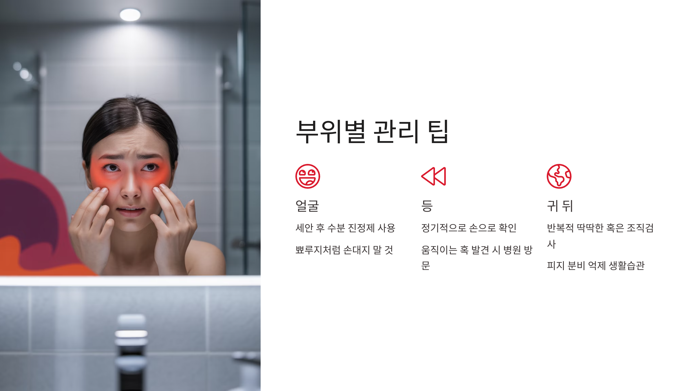피지낭종은 단순히 생겼다고 끝이 아닙니다. 위치에 따라 증상과 위험성, 관리 방법이 다르기 때문에 40대 이상 직장인이라면 '바쁜 일상' 속에서도 부위별 경고 신호를 놓치지 않는 습관이 중요합니다. 당신의 피부는 몸이 보내는 건강 신호입니다. 오늘부터 거울 한 번 더 보고, 이상 징후를 체크해 보세요.