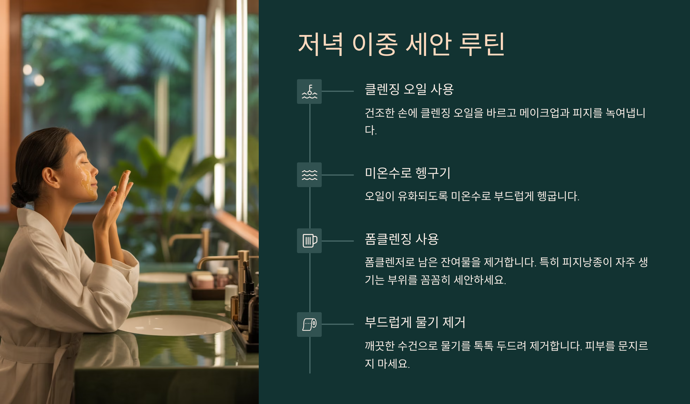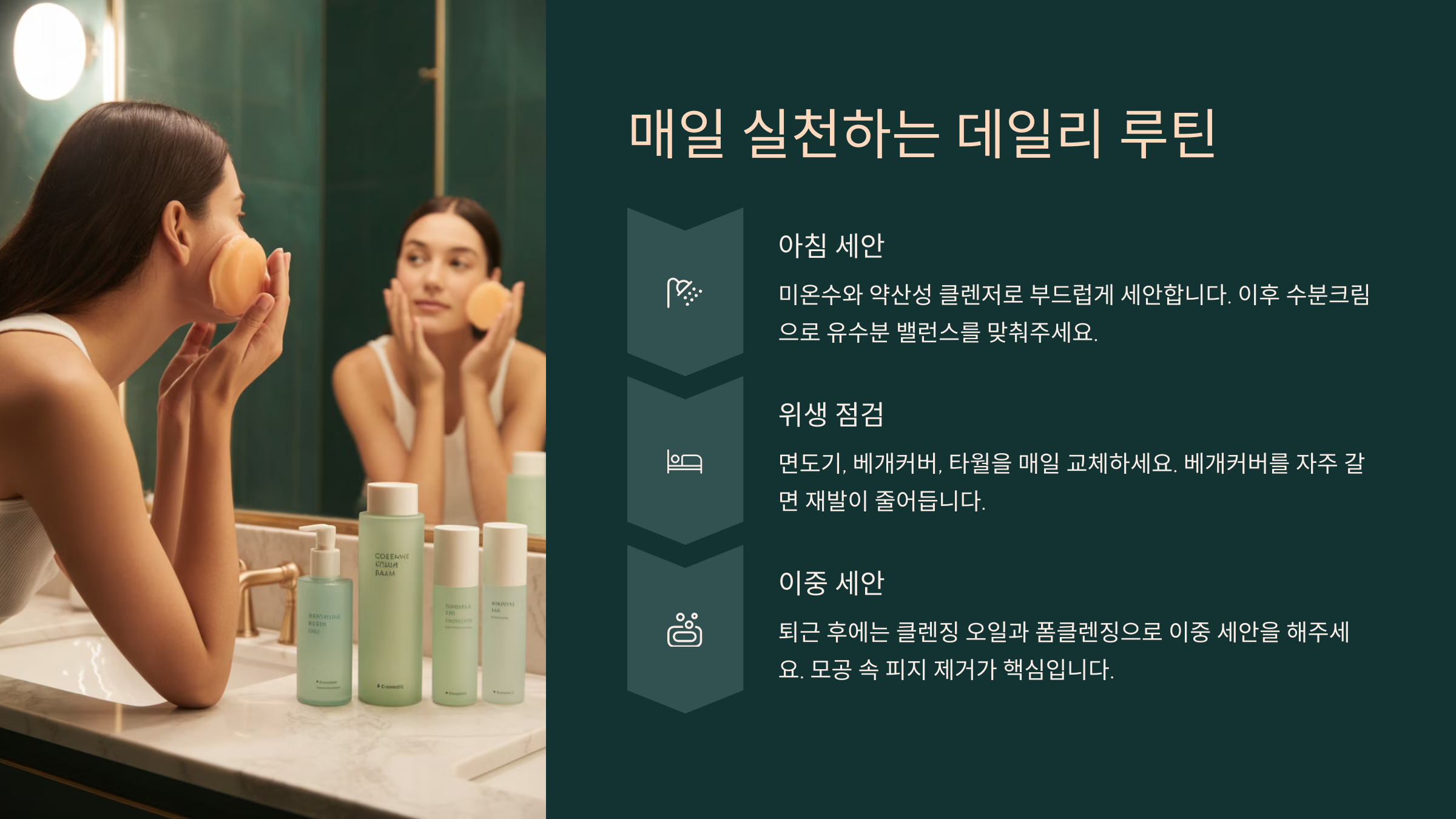 무조건 완벽하게 하지 않아도 괜찮습니다. 오늘부터 딱 하나만 실천해 보세요. 그 하나가 피부를 바꾸는 첫걸음이 될 수 있습니다.