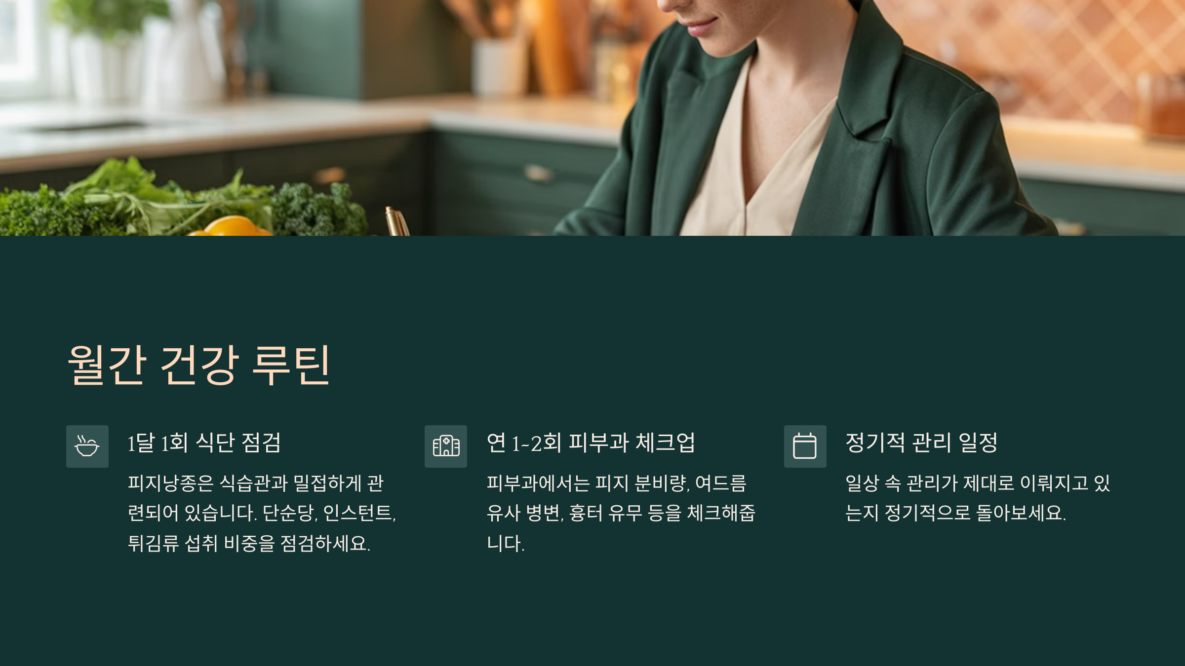 피지낭종은 식습관과도 밀접하게 관련되어 있습니다. 한 달에 한 번 식단을 리뷰해 보며 단순당, 인스턴트, 튀김류 섭취 비중을 점검하세요. 많은 후기에서 “밀가루 줄이자 낭종이 사라졌다”는 공통 의견이 확인되었습니다.