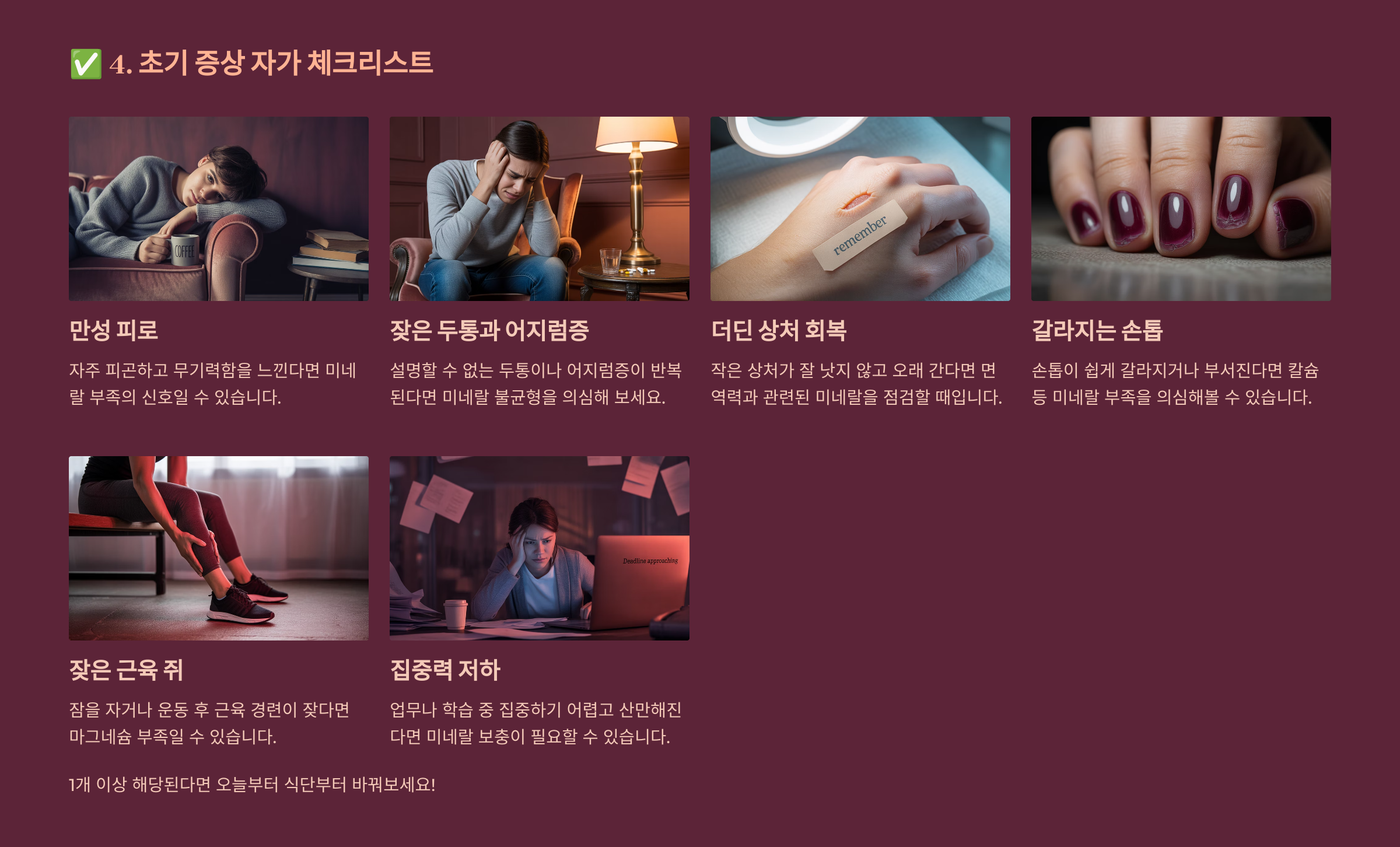 ✔️ 핵심 요약 설명: 피로, 근육 쥐, 손톱 갈라짐, 집중력 저하… 이런 사소한 증상들이 미네랄 부족의 시작 신호입니다! **마그네슘, 철분, 아연, 칼슘, 칼륨** 꼭 점검해 보세요.