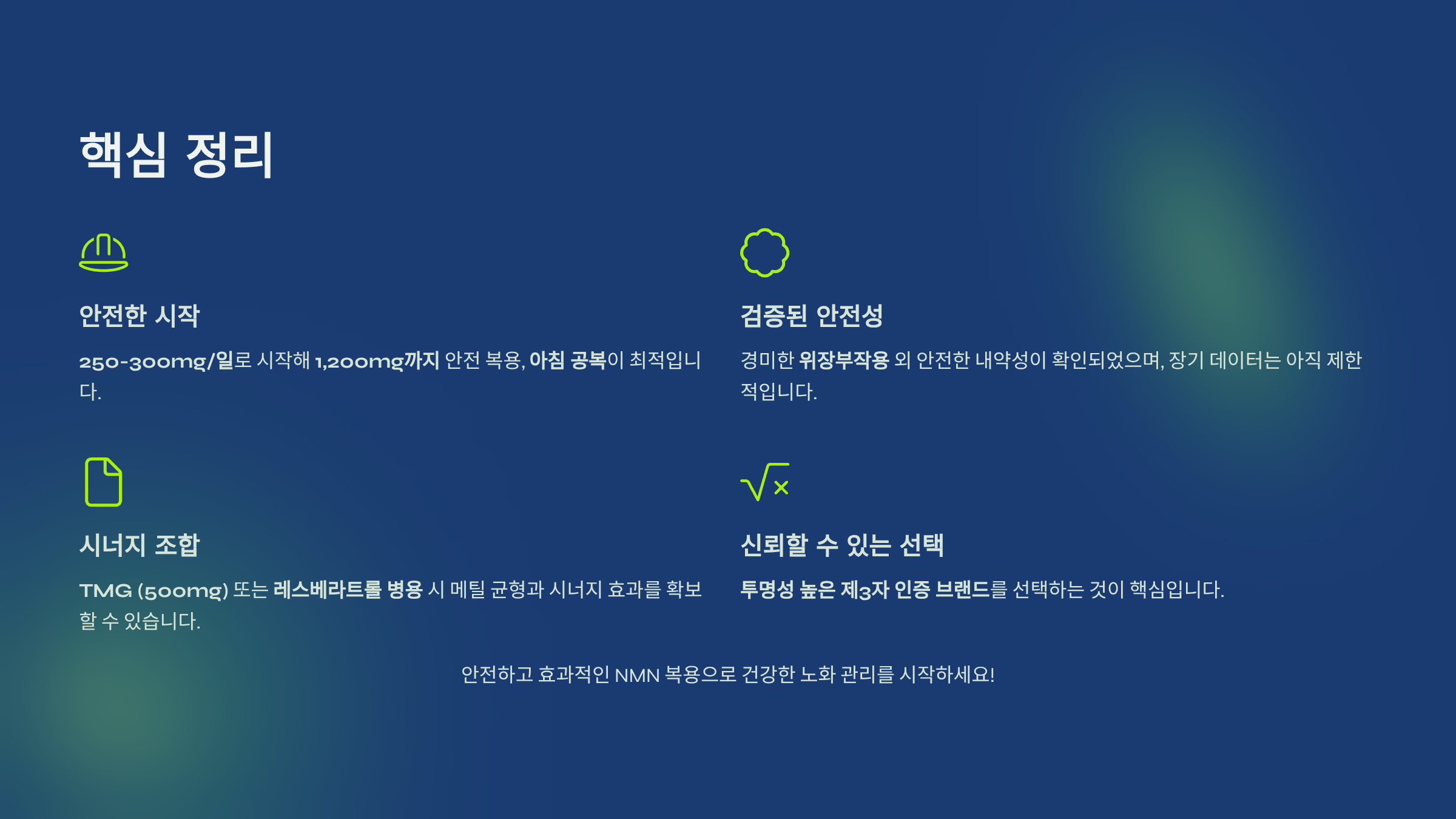 NMN 복용을 처음 시작하는 분도 5가지 핵심 체크포인트를 따라 하면 **안전하게 복용량 설정**, **부작용 최소화**, **조합 전략 구성**, 그리고 **신뢰 가능한 제품 선택법**까지 바로 적용 가능합니다. 실생활에서 바로 쓸 수 있는 복용법 가이드입니다.