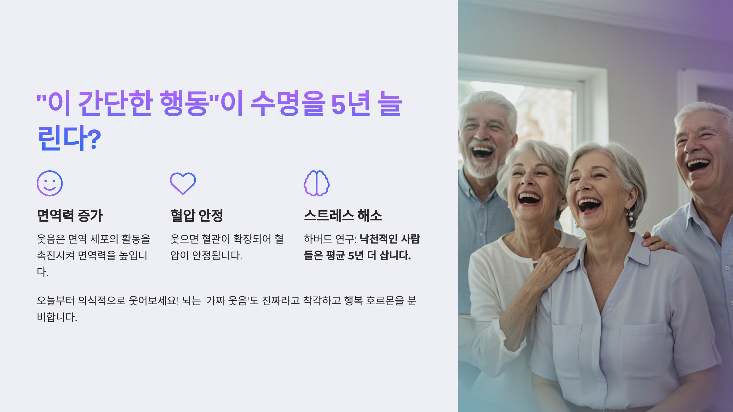 믿기 어려울 수도 있지만, 매일 **"웃는 습관"**만 가져도 수명이 연장될 수 있습니다.