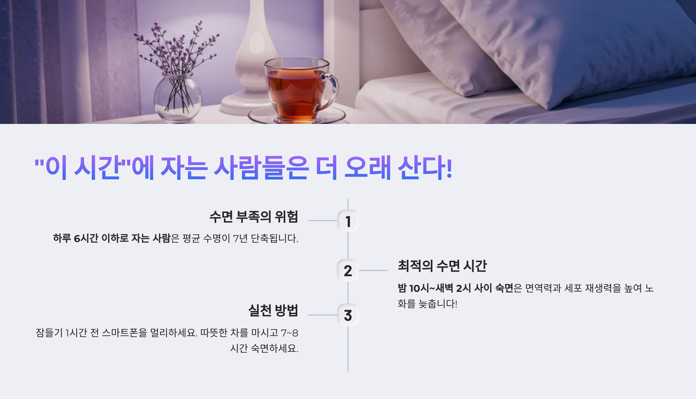 - 반대로, 밤 10시~새벽 2시 사이에 숙면을 취하는 사람은 면역력과 세포 재생력이 높아져 노화가 늦어집니다!