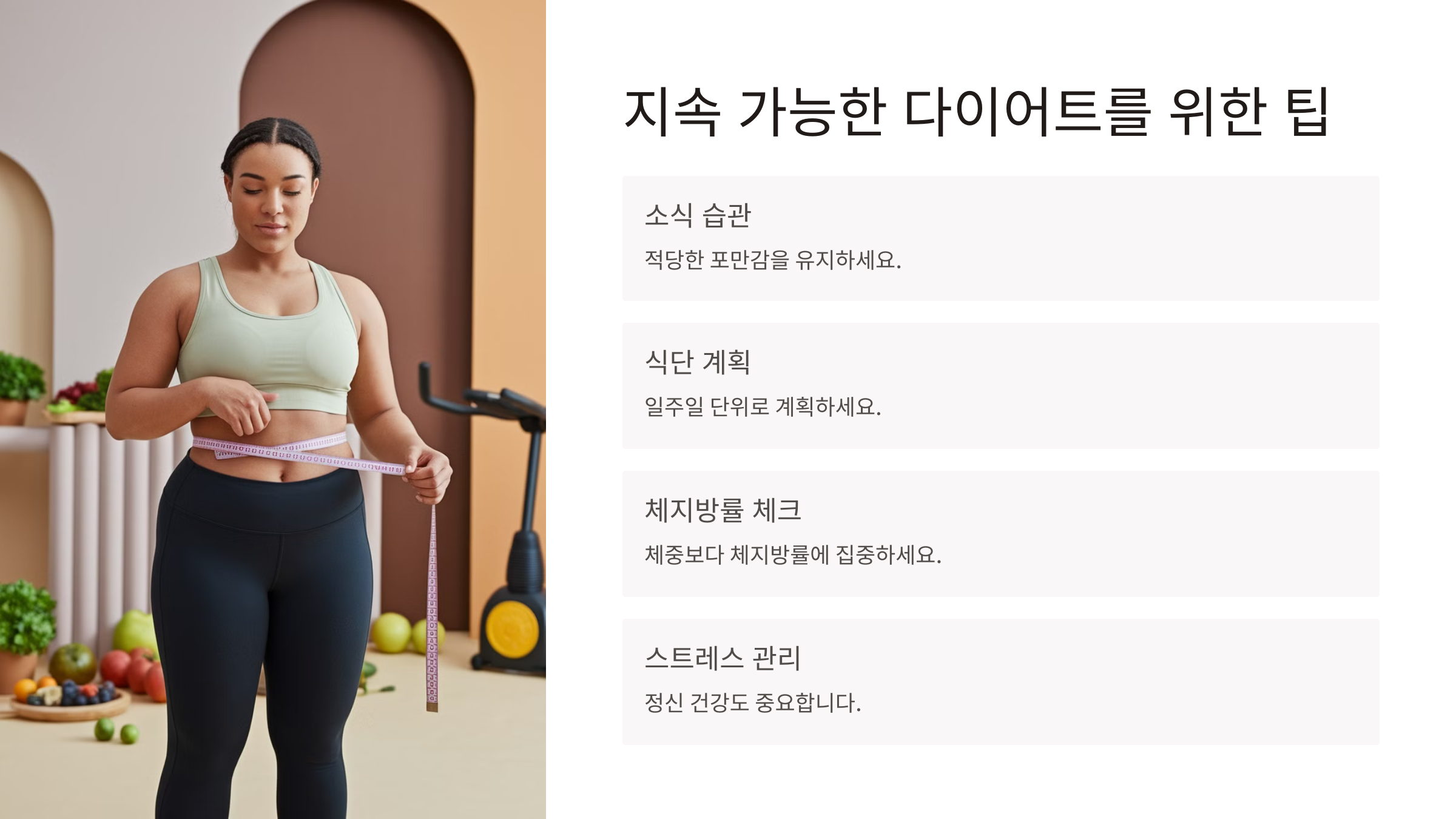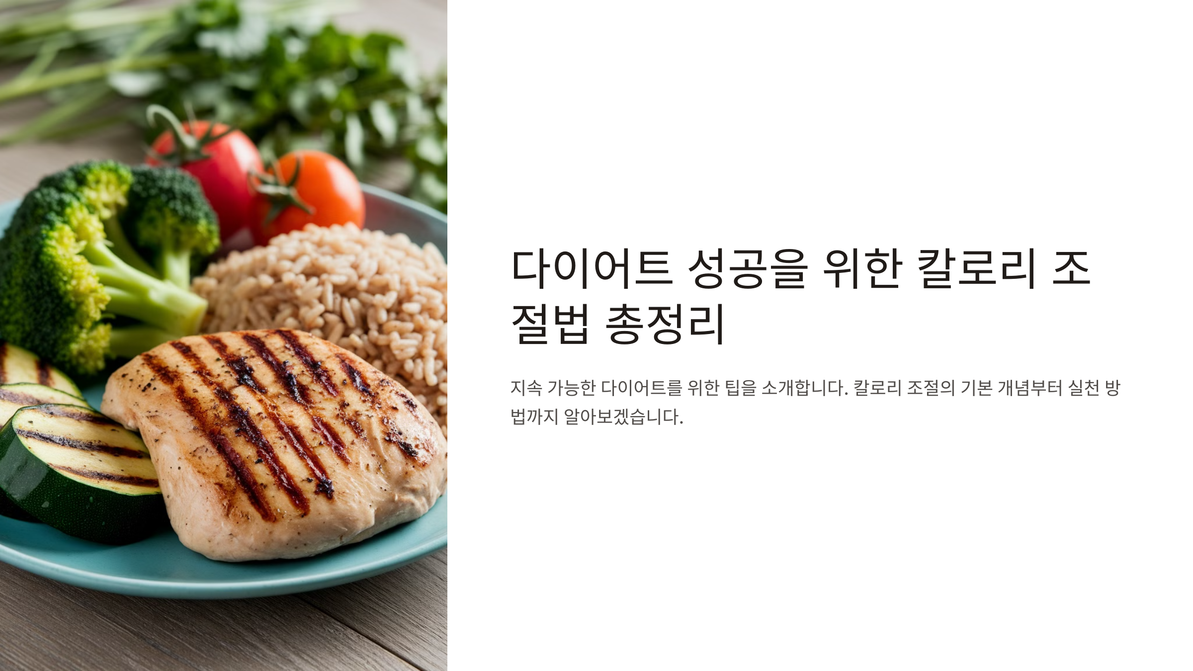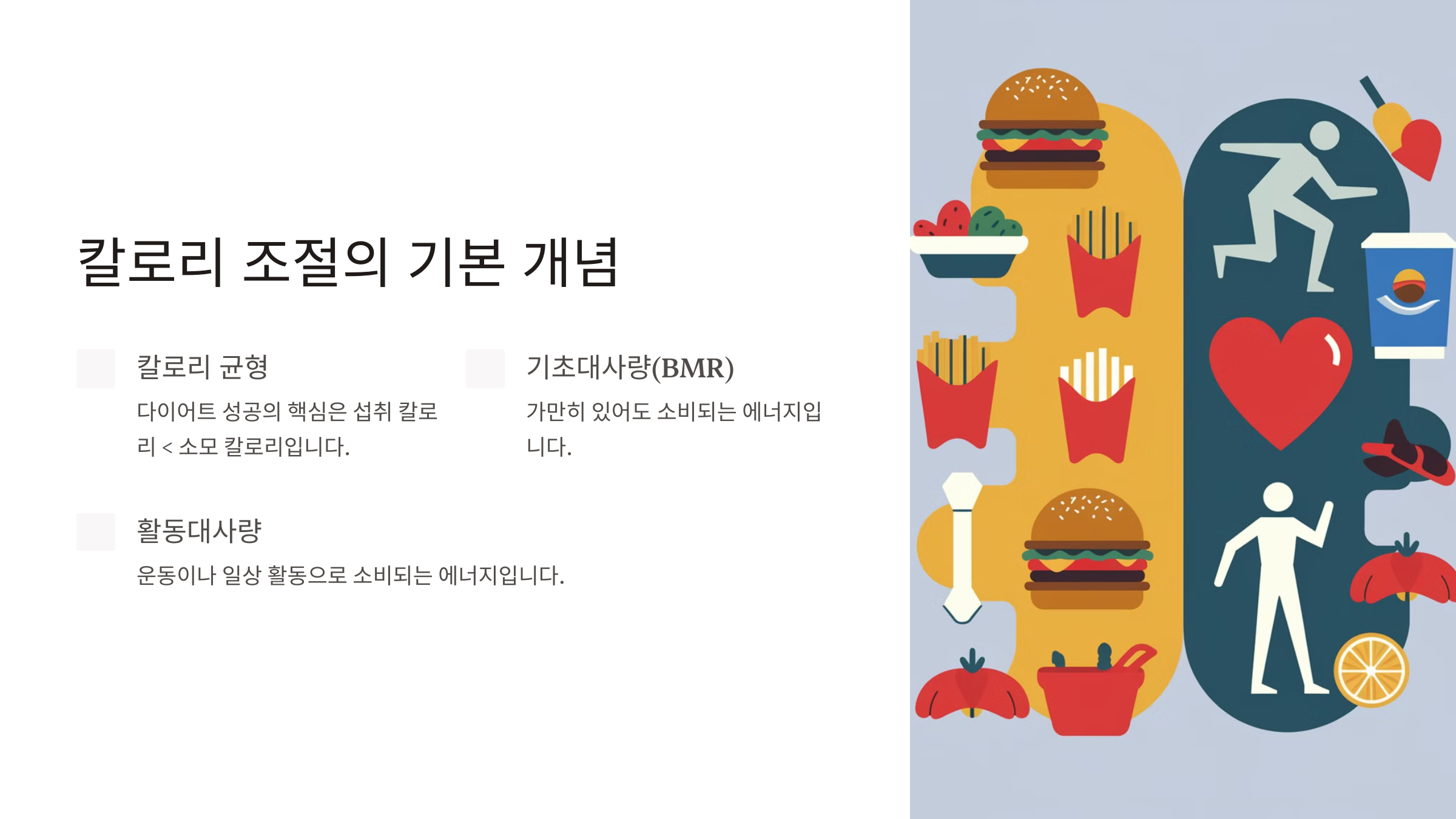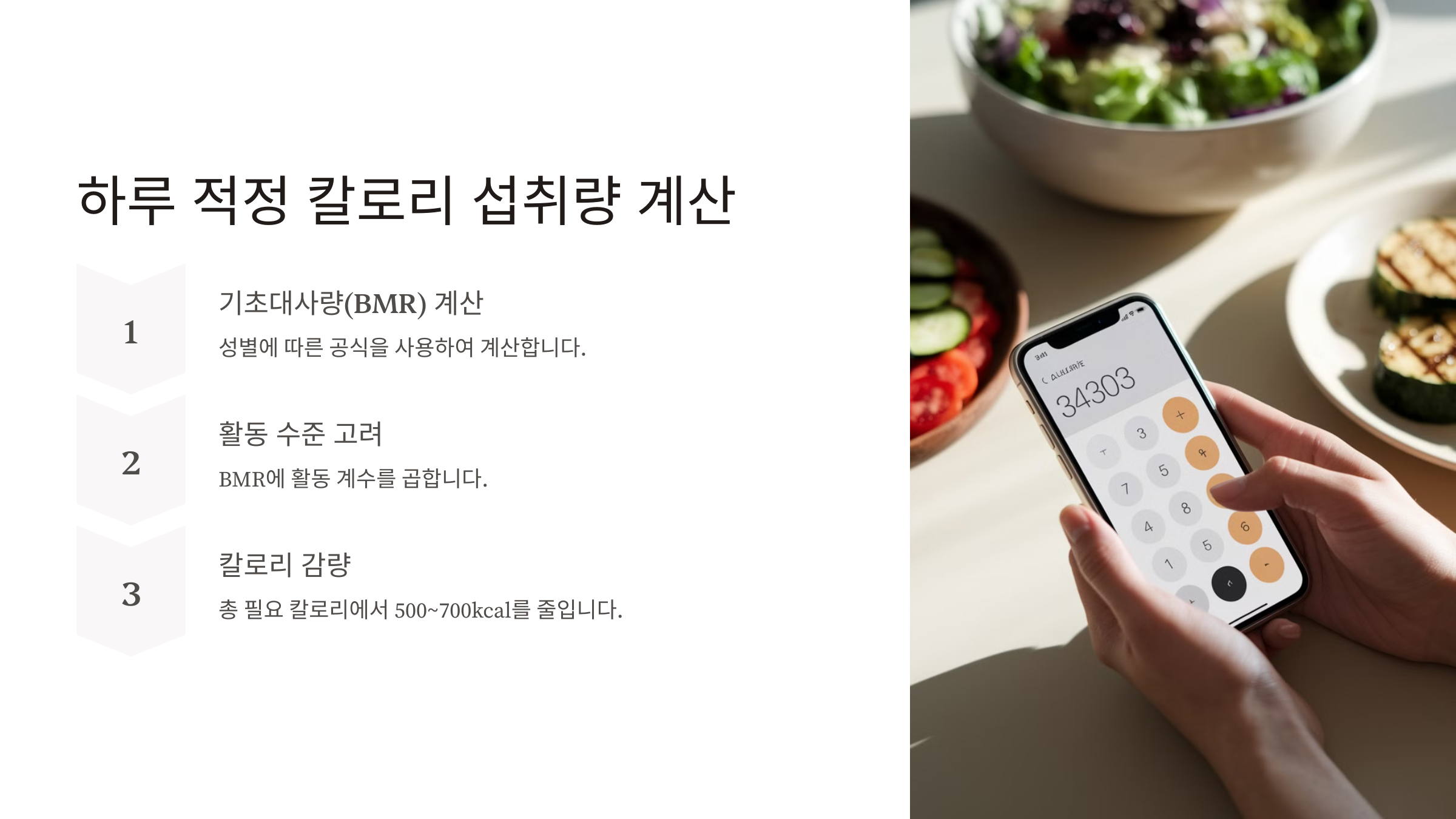 칼로리를 조절하면서도 균형 잡힌 식단을 유지하는 게 중요해요. 무조건 적게 먹기보다는 영양소를 균형 있게 섭취해야 해요!