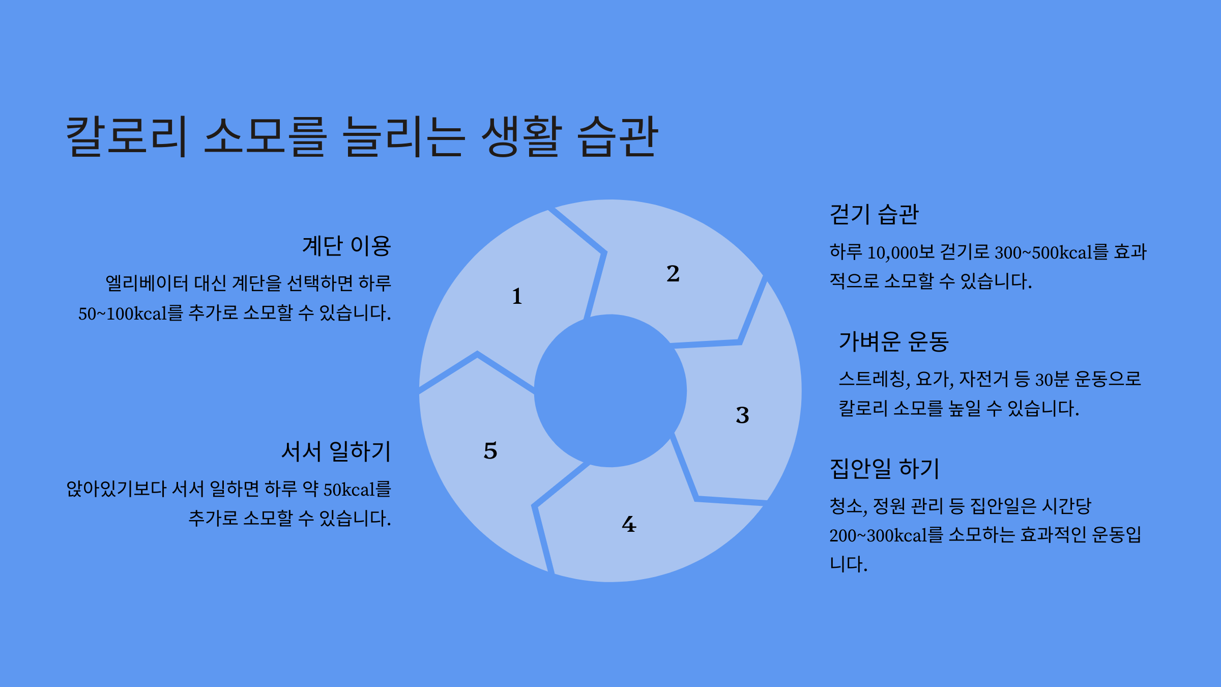 칼로리를 줄이는 것만큼 소모하는 것도 중요해요. 운동뿐만 아니라 일상 속에서도 칼로리를 더 태울 수 있는 방법이 많답니다.