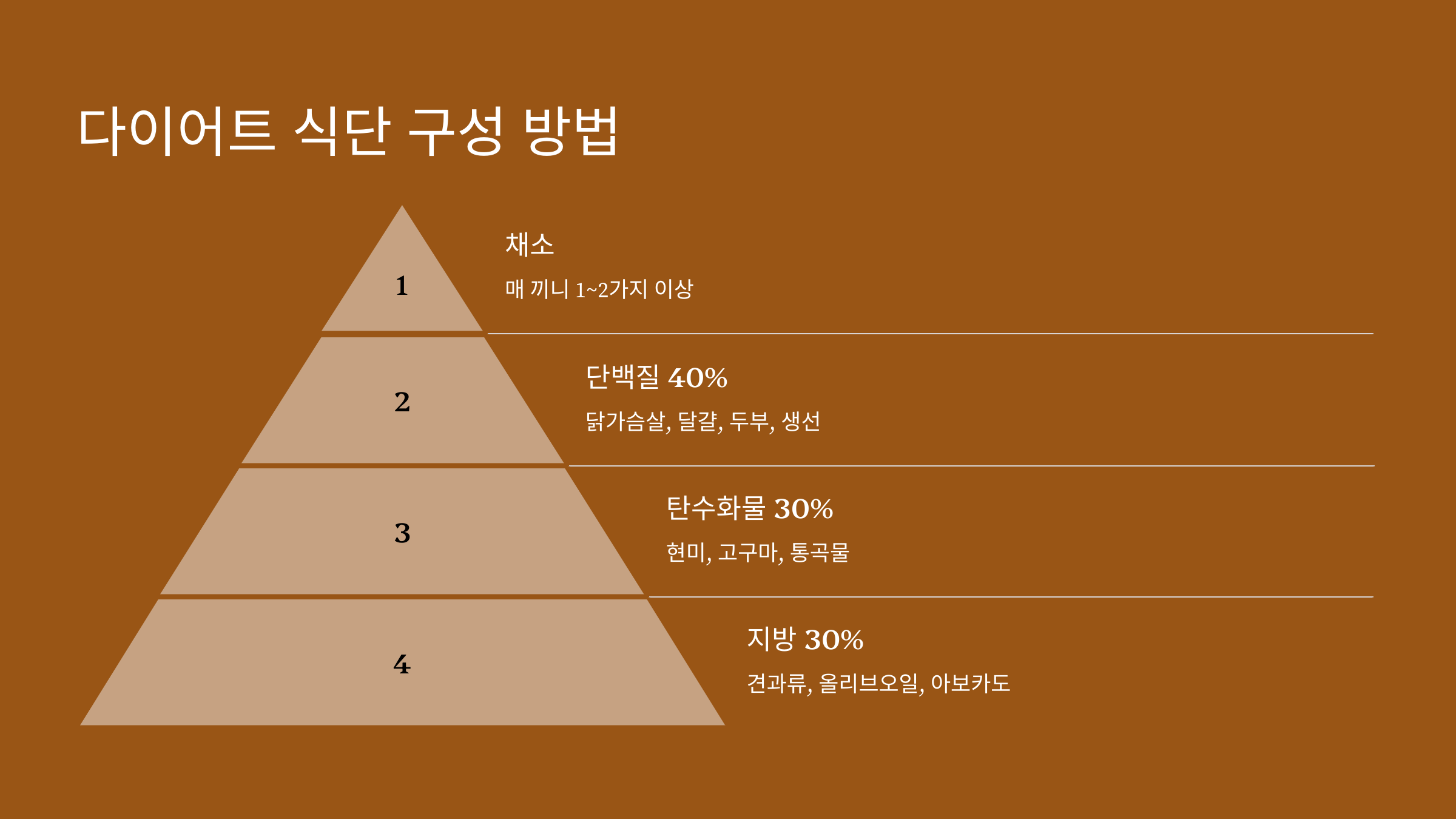 ✅ 단백질(40%): 닭가슴살, 달걀, 두부, 생선