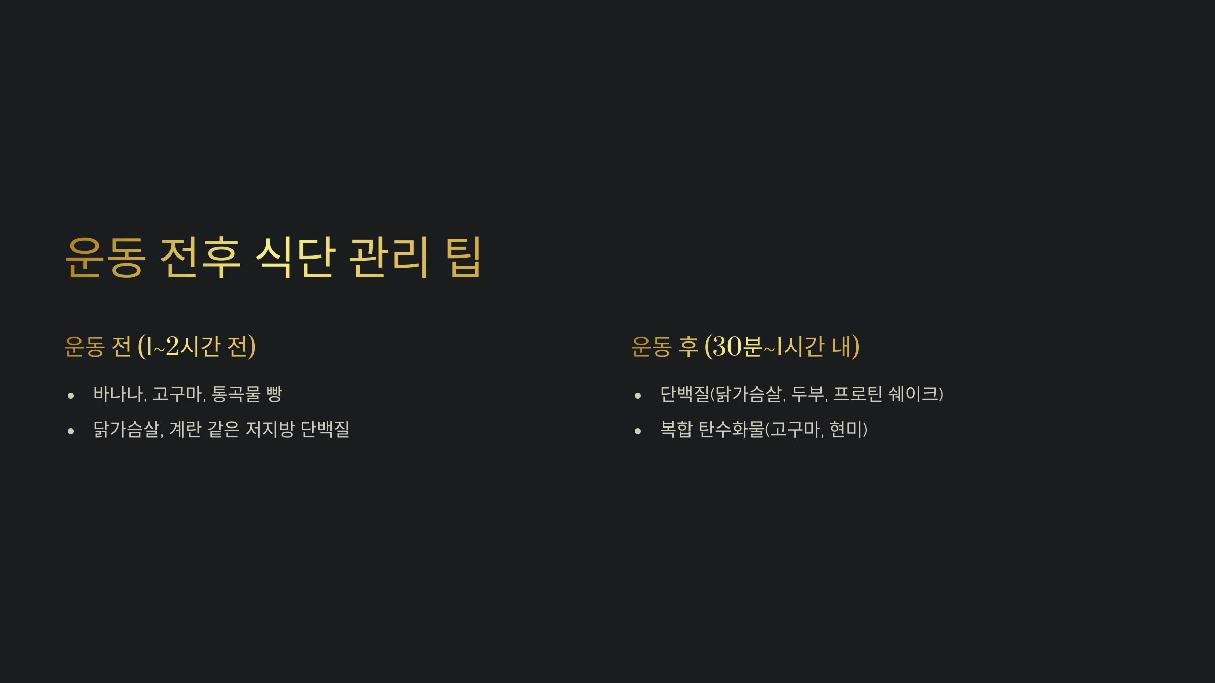 • 🚫 주의할 점운동 후 설탕, 정제 탄수화물을 많이 먹으면 지방으로 전환될 수 있어요!