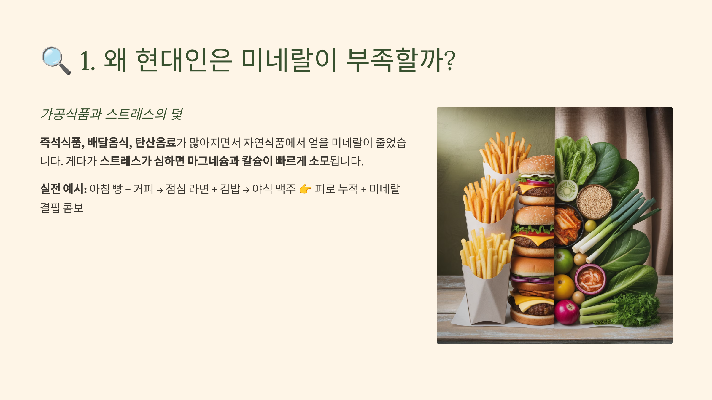 > 실전 예시: 아침 빵 + 커피 → 점심 라면 + 김밥 → 야식 맥주 👉 피로 누적 + 미네랄 결핍 콤보