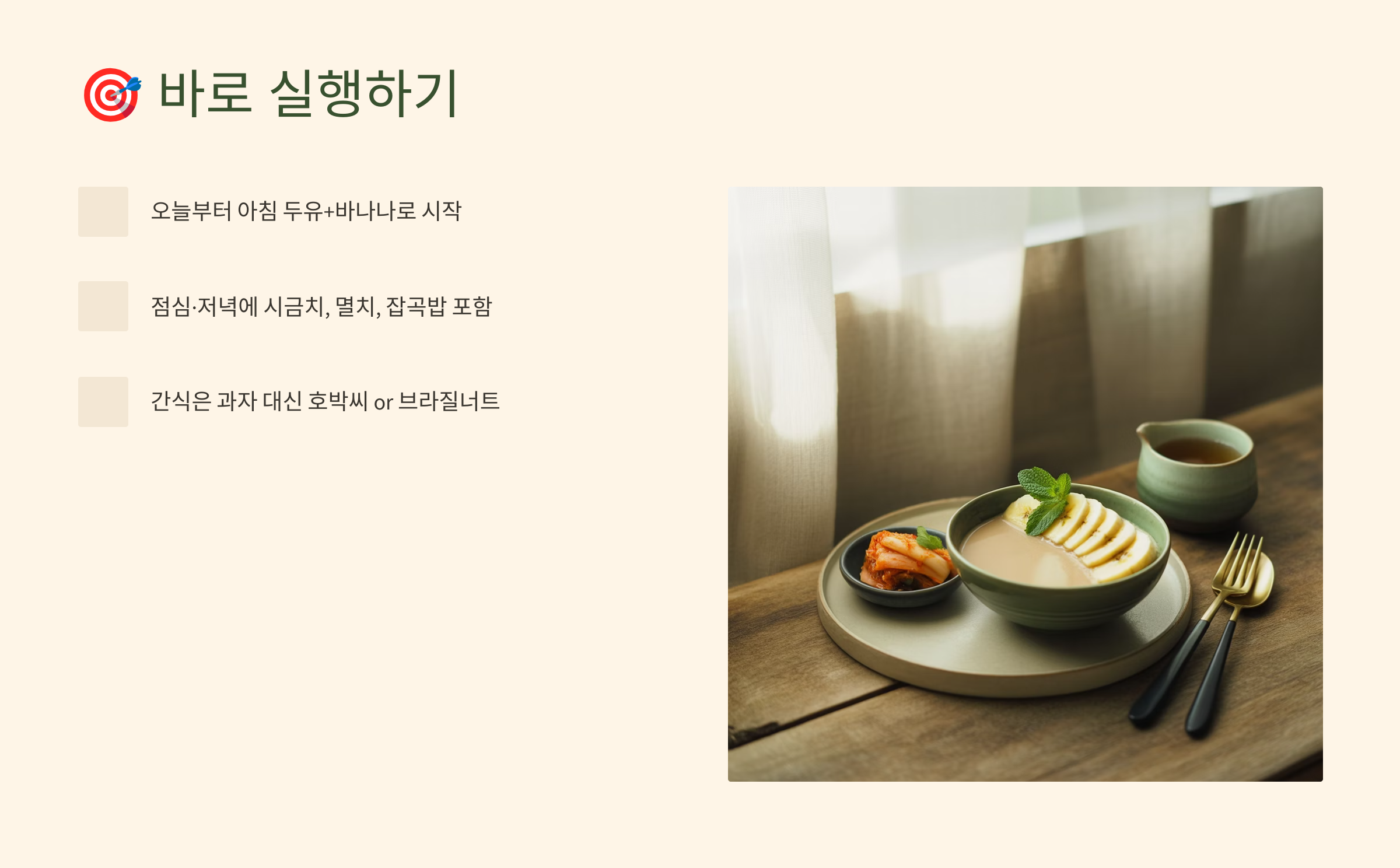> 예시 루틴: 아침: **두유 + 바나나** 점심: **잡곡밥 + 시금치 + 멸치볶음** 간식: **호박씨 한 줌 or 브라질너트 1알**