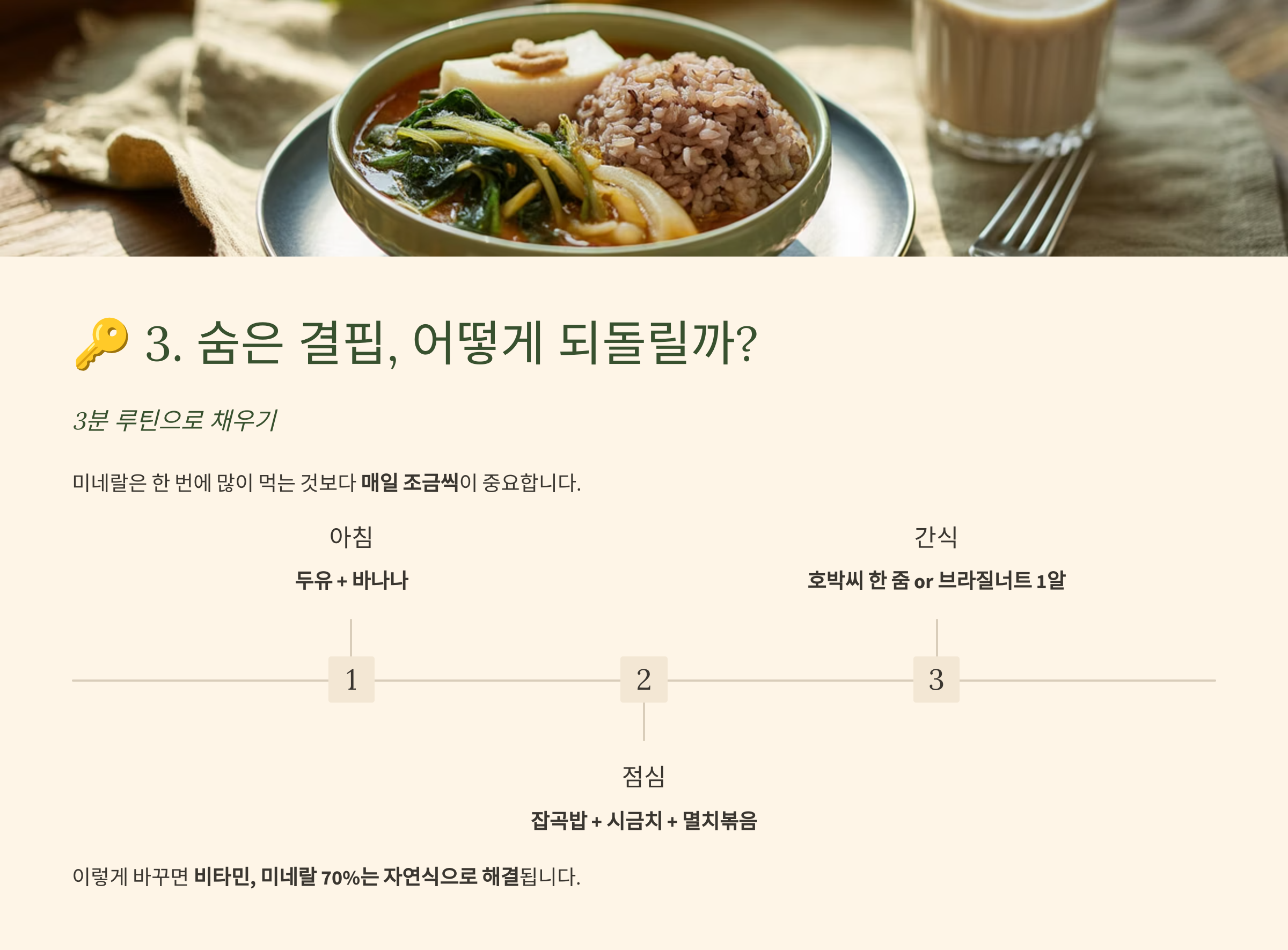 > 예시 루틴: 아침: **두유 + 바나나** 점심: **잡곡밥 + 시금치 + 멸치볶음** 간식: **호박씨 한 줌 or 브라질너트 1알**
