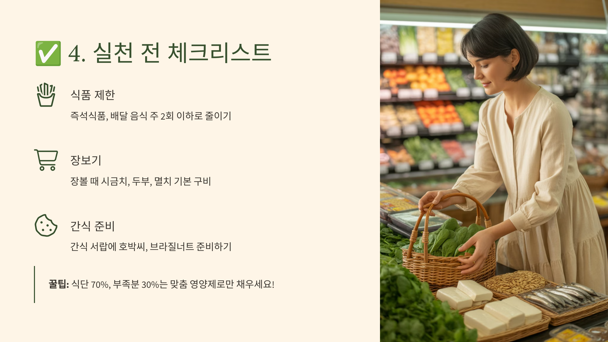 > 꿀팁: 식단 70%, 부족분 30%는 **맞춤 영양제로만 채우세요!**