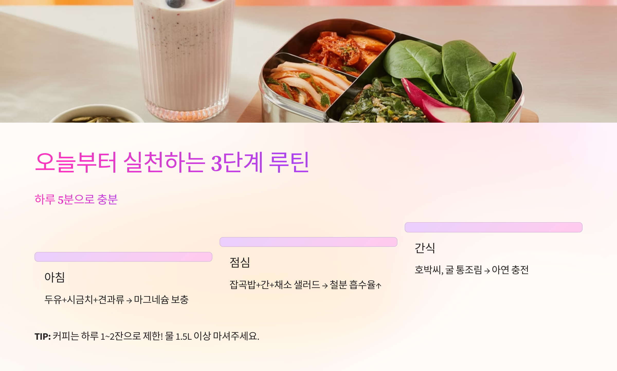 1️⃣ **아침:** 두유+시금치+견과류 → 마그네슘 보충 2️⃣ **점심:** 잡곡밥+간+채소 샐러드 → 철분 흡수율↑ 3️⃣ **간식:** 호박씨, 굴 통조림 → 아연 충전