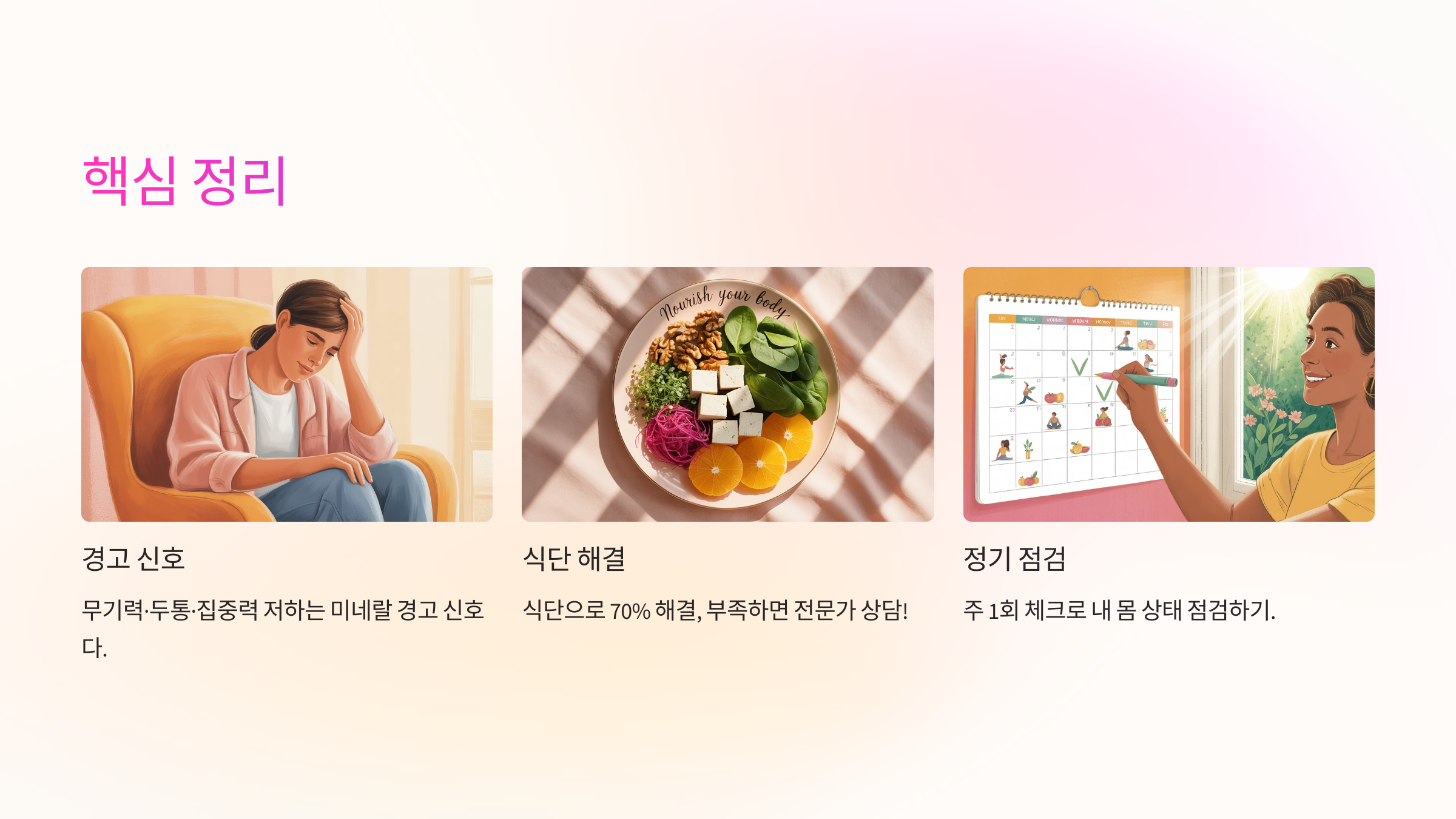1️⃣ **마그네슘 부족 → 무기력, 근육 쥐** 2️⃣ **철분 부족 → 산소 운반 저하, 두통** 3️⃣ **아연 부족 → 신경 전달 저하, 집중력 저하**