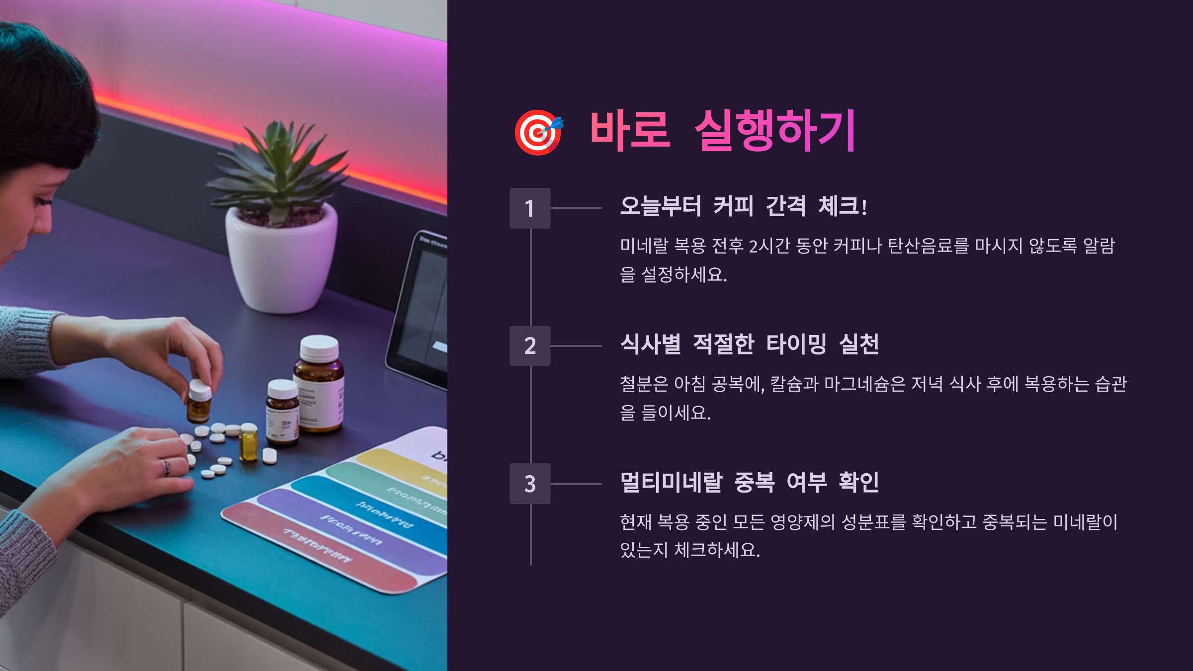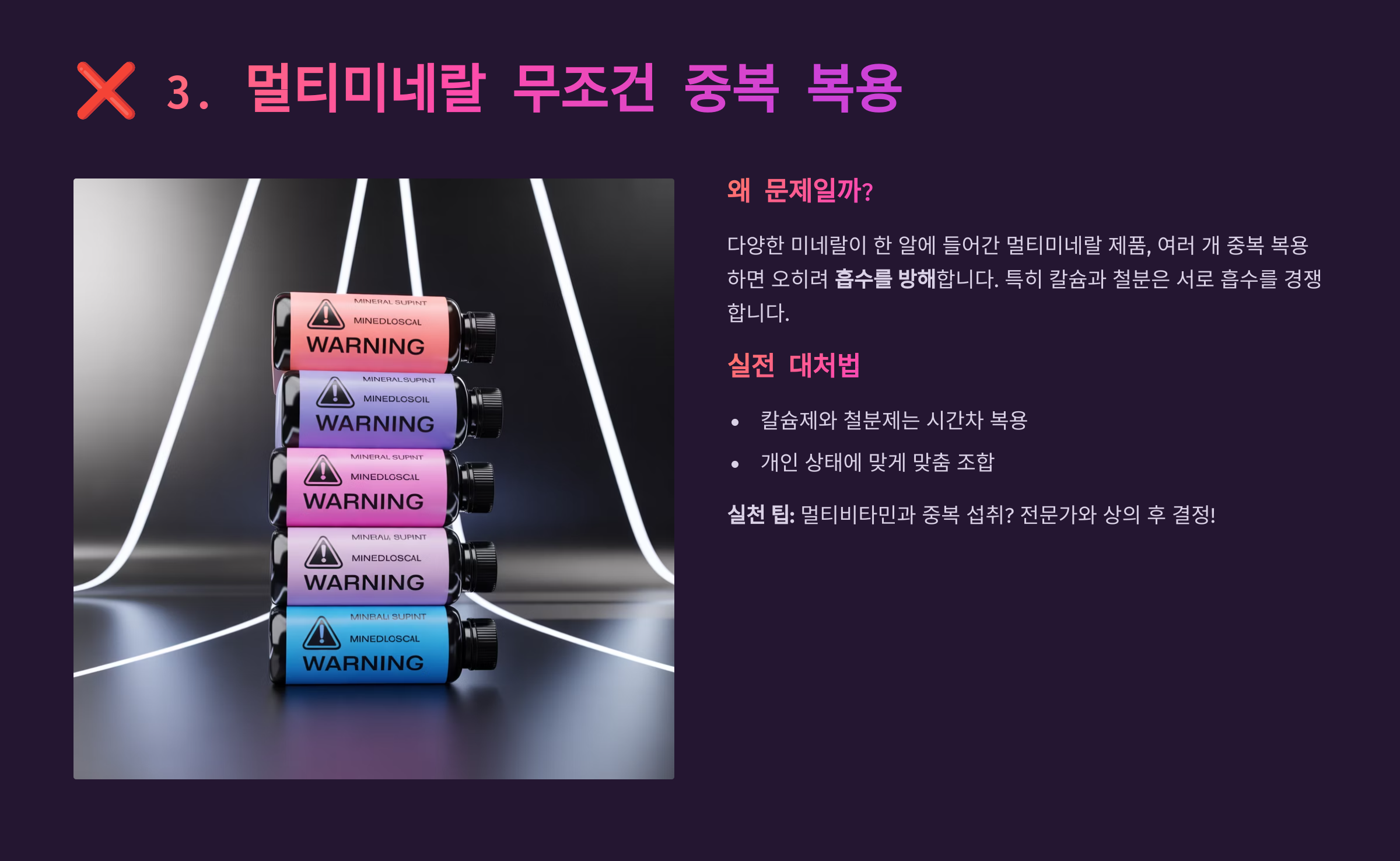 | 멀티미네랄 중복 | 흡수 경쟁 발생 | 성분별 시간차 섭취 |