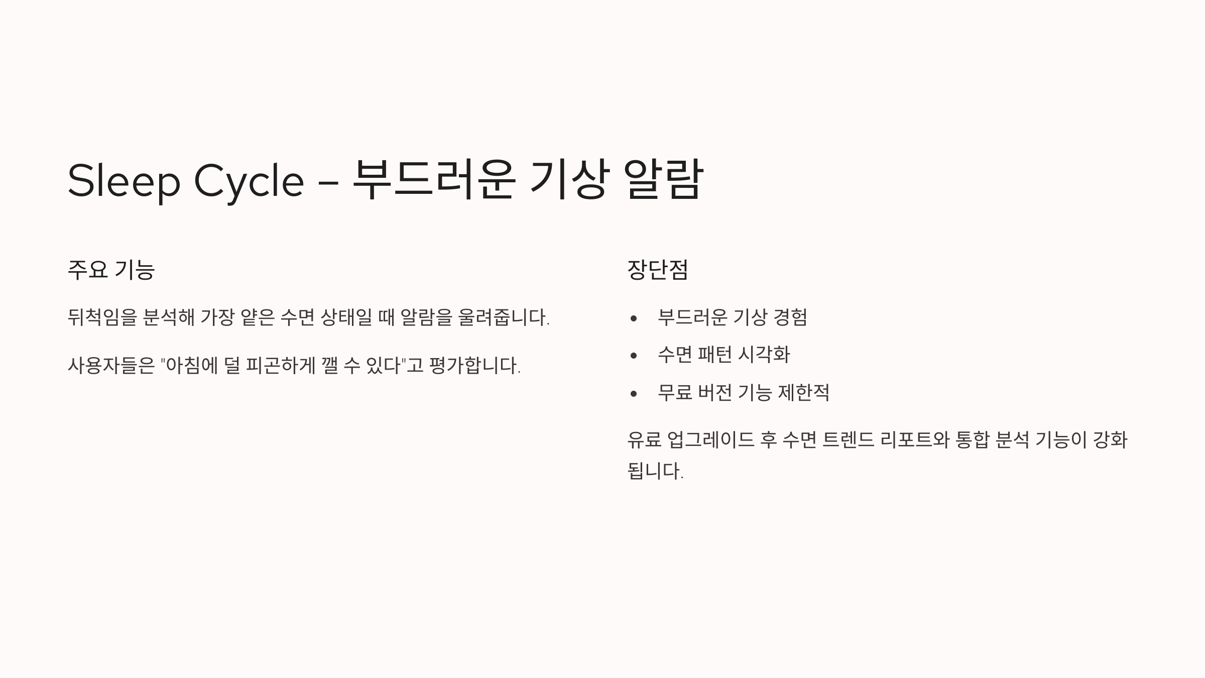 수면 중 뒤척임을 분석해 가장 얕은 수면 상태일 때 알람을 울려주는 기능이 핵심입니다. 사용자 리뷰에 따르면 “아침에 덜 피곤하게 깰 수 있다”는 피드백이 많습니다. 단점은 무료 버전의 기능이 제한적이라는 점. 유료 업그레이드 후 수면 트렌드 리포트와 통합 분석 기능이 강화됩니다.