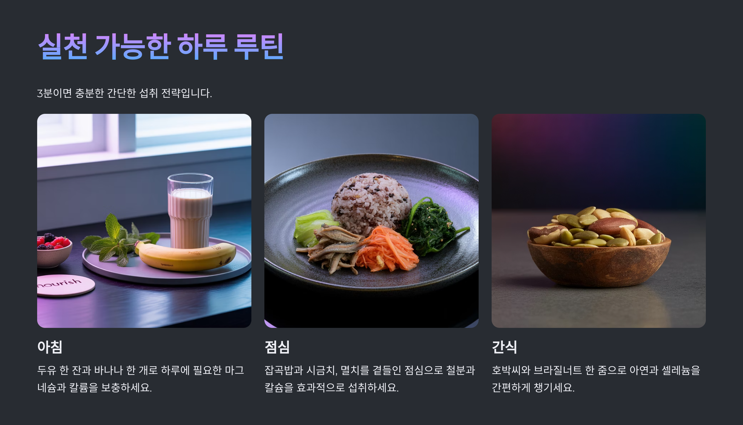 > 아침: 두유 + 바나나 → 마그네슘, 칼륨 > 점심: 잡곡밥 + 시금치무침 + 멸치볶음 → 철분, 칼슘 > 간식: 호박씨 한 줌, 브라질너트 1알 → 아연, 셀레늄