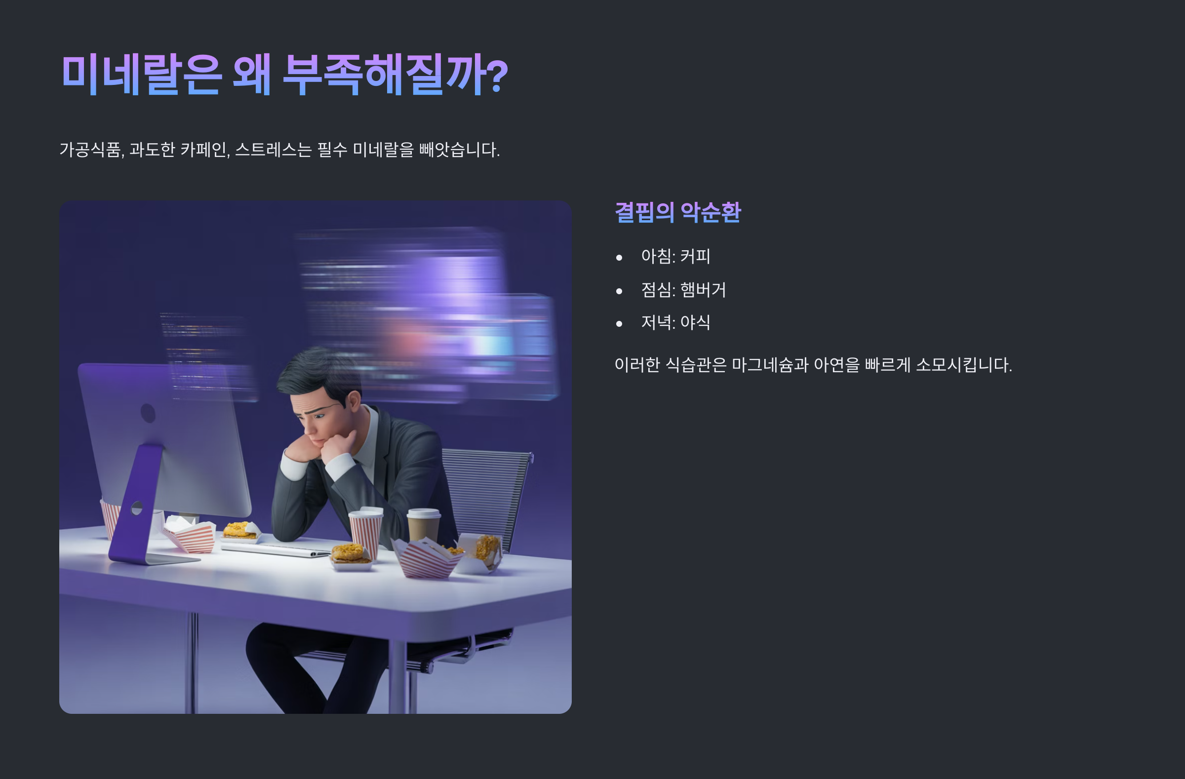 > 예시: 아침 커피 → 점심 햄버거 → 저녁 야식 → 미네랄 결핍 악순환