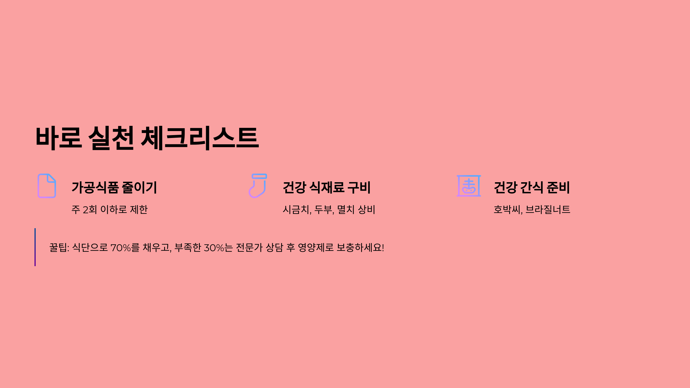 > 꿀팁: 식단으로 70%, 부족한 30%는 전문가 상담 후 영양제로!
