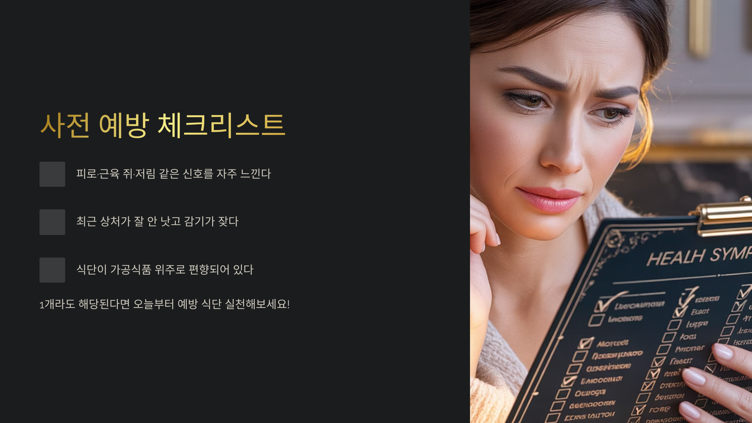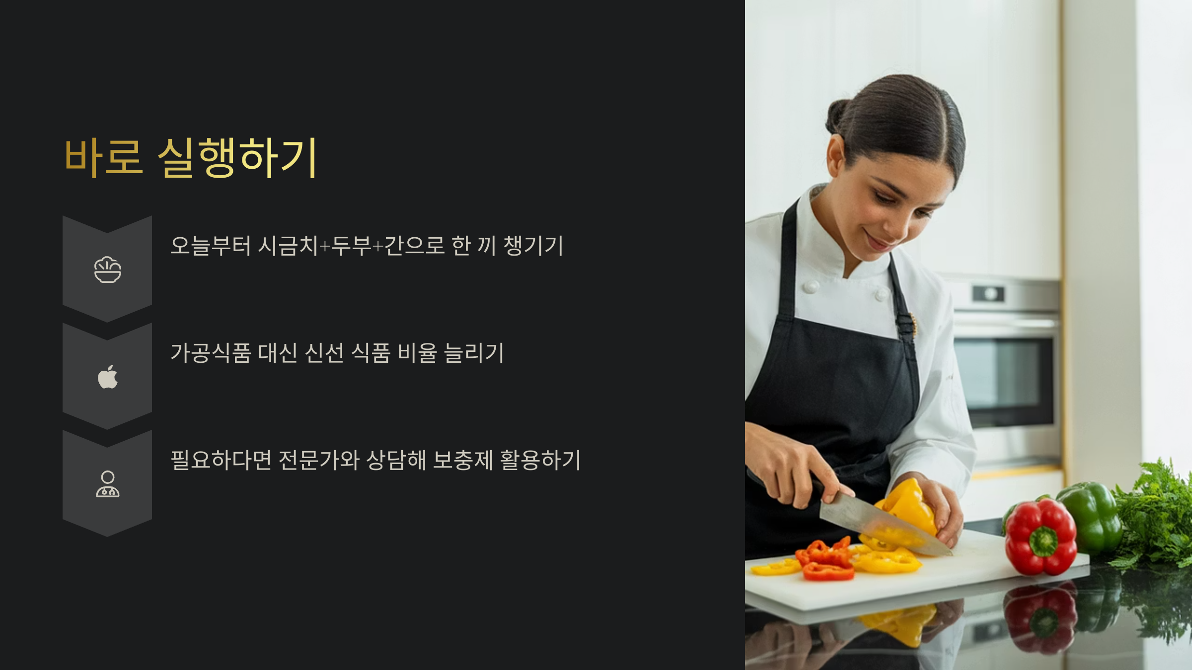 > TIP: 하루 한 끼만 바꿔도 질병 예방 확률이 달라집니다!