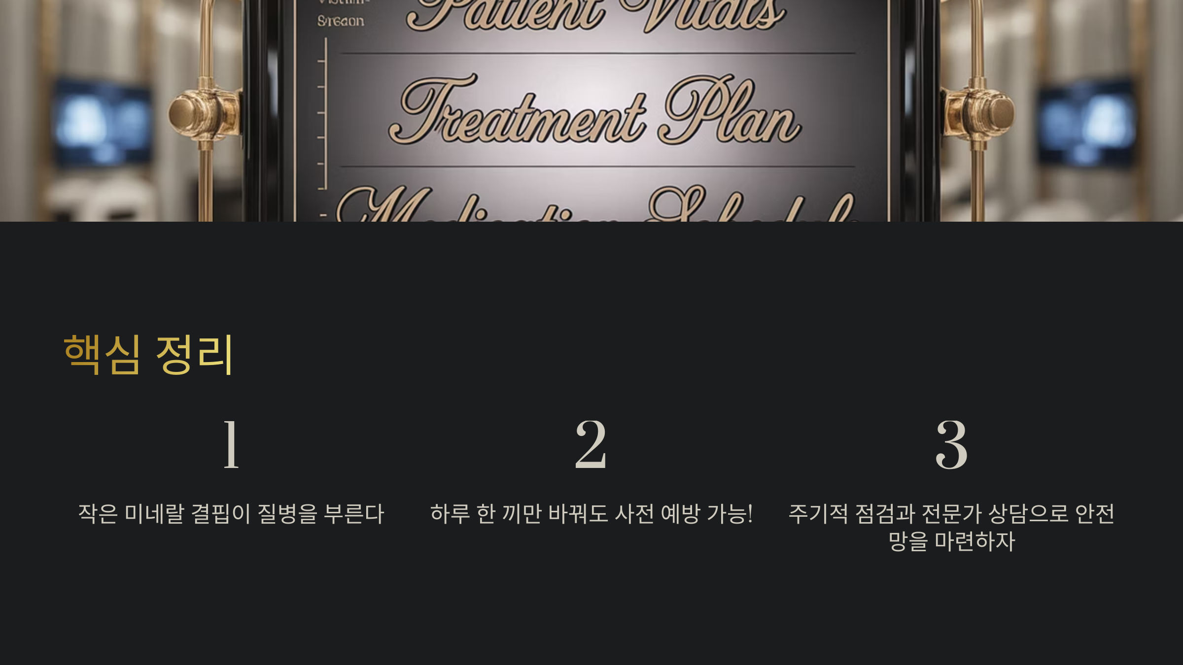 “작은 결핍이 큰 병으로 이어집니다.” 이 글을 보면 미네랄 부족으로 생길 수 있는 대표 질병과 사전에 예방할 수 있는 간단한 식단·습관을 바로 확인할 수 있습니다.