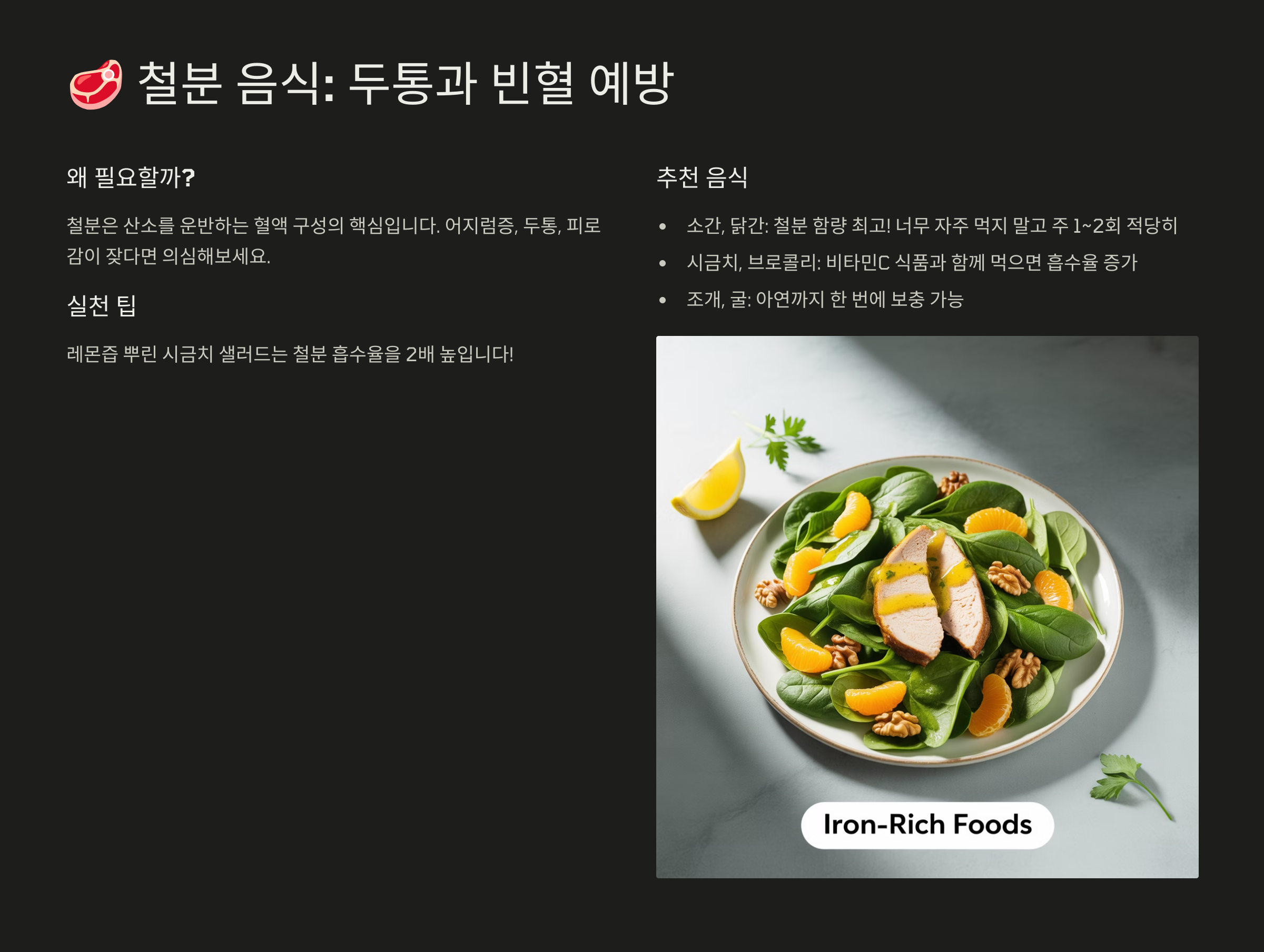 🥩 2. 철분 음식: 두통과 빈혈 예방