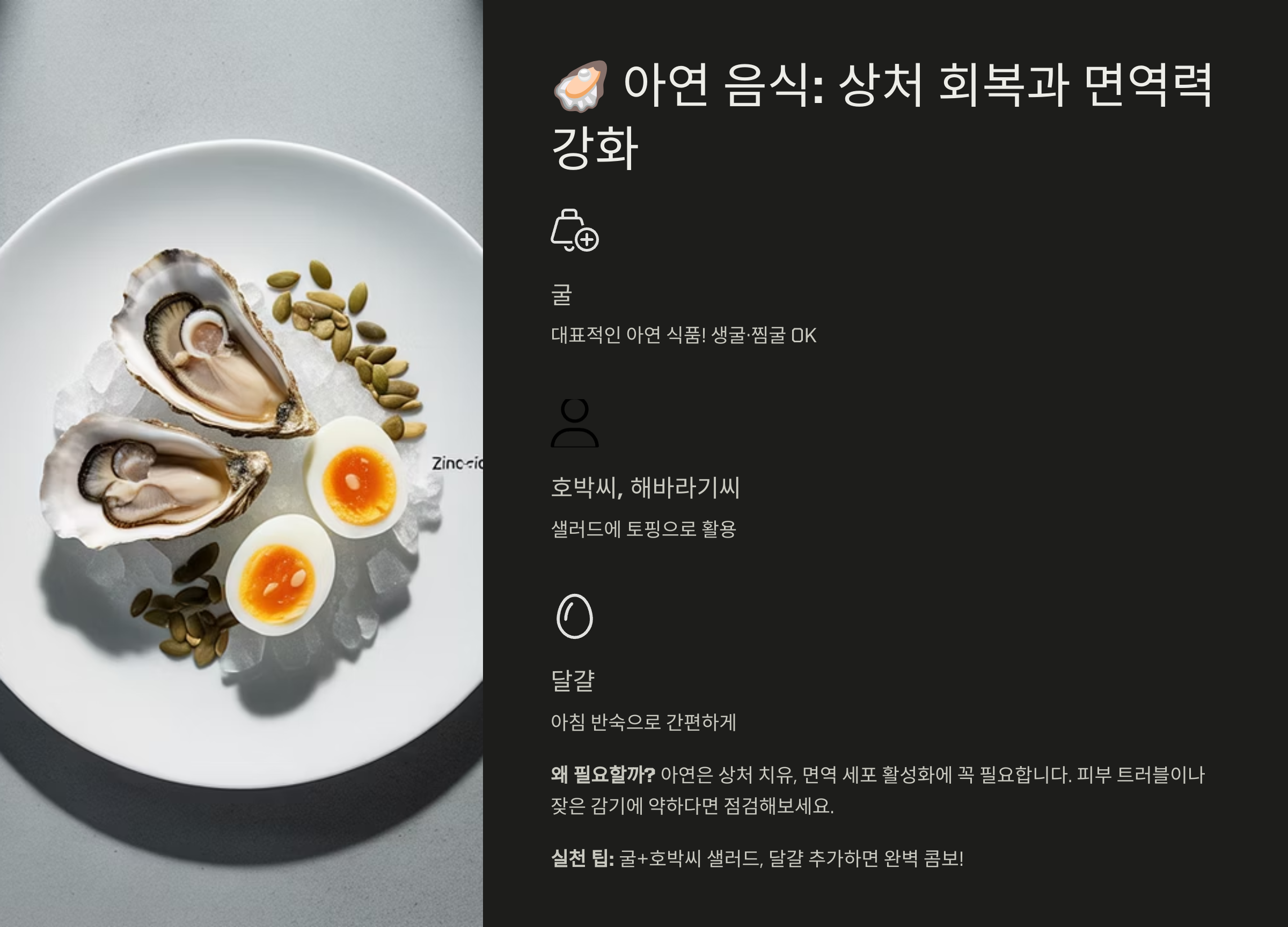 • ✔️ **굴:** 대표적인 아연 식품! 생굴·찜굴 OK