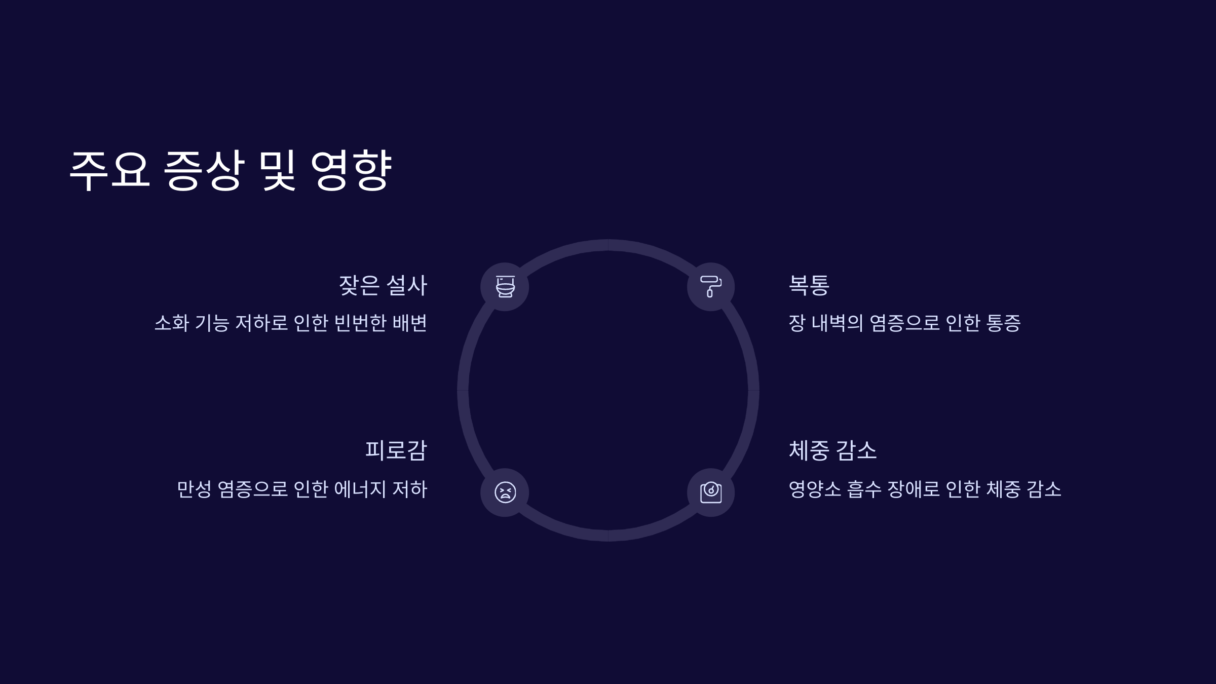 대표적인 증상으로는 잦은 설사, 복통, 체중 감소, 피로감 등이 있습니다. 증상이 심해지면 일상생활이 어려워지고 영양 결핍이 발생할 수도 있습니다. 따라서 염증을 줄이고 장 건강을 유지하는 것이 중요합니다.