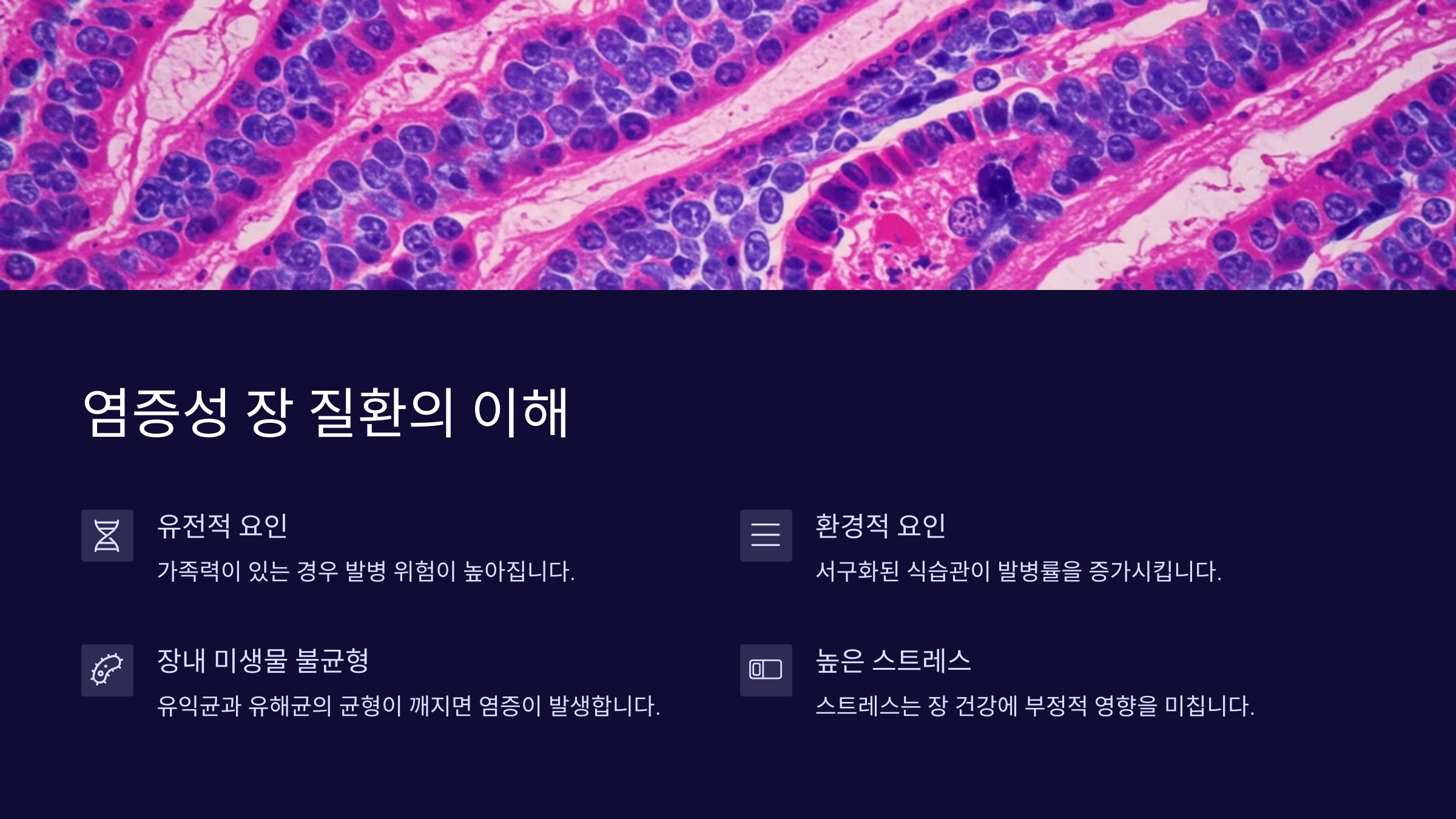 우리는 매일 음식을 섭취하고 소화하며 영양을 흡수합니다. 하지만 현대인의 식습관과 스트레스는 장 건강을 위협하는 가장 큰 원인이 되고 있습니다. 잦은 복통, 설사, 소화 불량과 같은 증상을 무심코 넘긴 적이 있나요? 만약 그렇다면, 염증성 장 질환(IBD)을 의심해봐야 합니다.