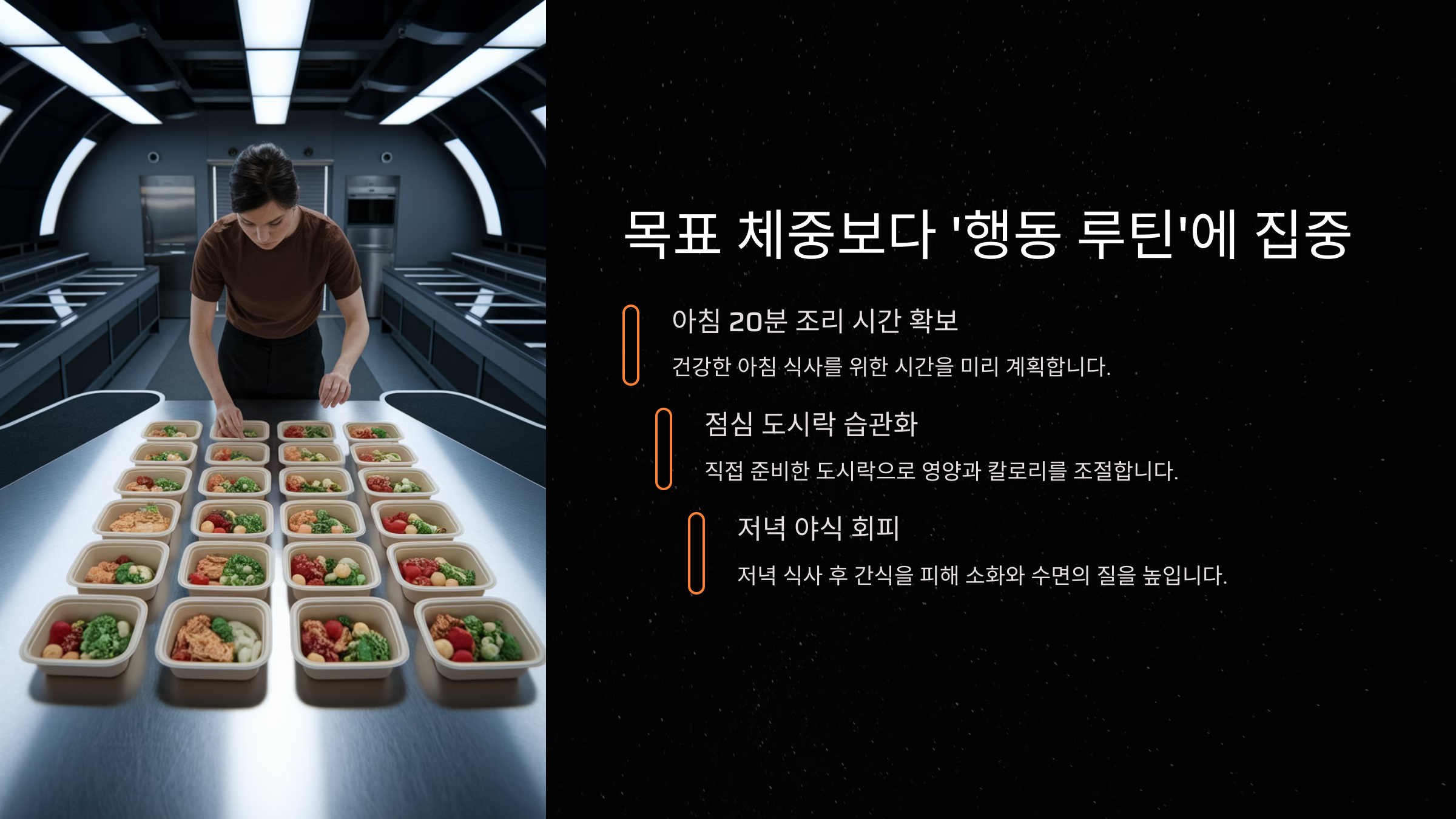 체중은 일시적으로 줄었다가 다시 늘 수 있습니다. 하지만 식습관이라는 루틴이 잡히면 건강은 안정적으로 개선됩니다. 예를 들어 매일 아침 20분 조리 시간 확보, 점심 도시락 습관화, 저녁 야식 회피 등 작고 구체적인 루틴이 진짜 변화를 만듭니다.