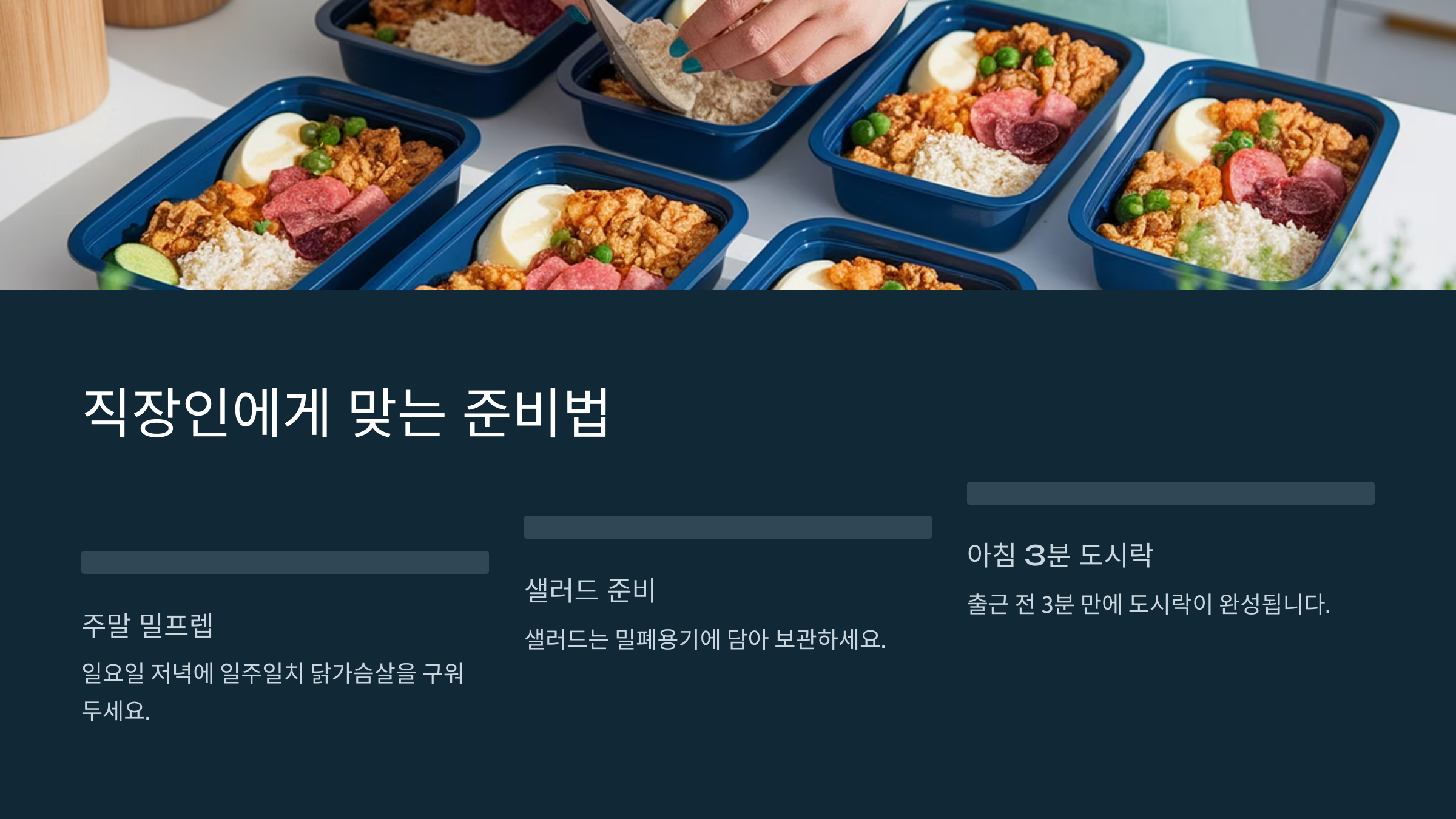 아침에 바쁜 직장인은 미리 식재료를 손질해 두는 것이 핵심입니다. 일요일 저녁에 일주일치 닭가슴살을 구워 두고, 샐러드는 밀폐용기에 담아 보관하면 아침 출근 전 3분 만에 도시락이 완성됩니다. 많은 사용자 리뷰에서 “전날 미리 준비해 두면 성공 확률이 올라간다”라고 말하며, 주말 ‘밀프렙’(Meal Prep)이 저탄수화물 식단의 핵심 전략으로 꼽혔습니다.