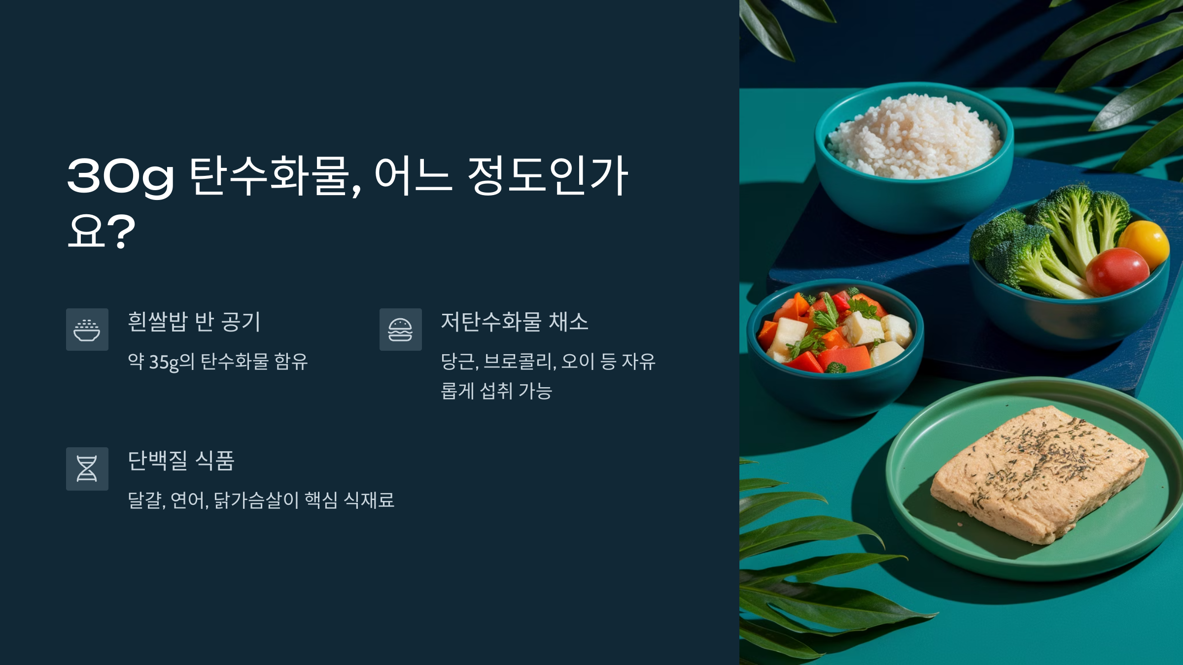 30g이라고 하면 감이 잘 안 오실 수 있습니다. 예를 들어, 흰쌀밥 반 공기(100g)에 탄수화물이 약 35g입니다. 즉, 하루에 밥 반 공기만 먹어도 이미 기준치를 넘기는 셈입니다. 대신 채소류, 단백질, 지방을 중심으로 식단을 재구성하면 생각보다 다양한 식사가 가능합니다. 당근, 브로콜리, 오이 등 저탄수화물 채소와 달걀, 연어, 닭가슴살 등의 식재료가 핵심입니다.