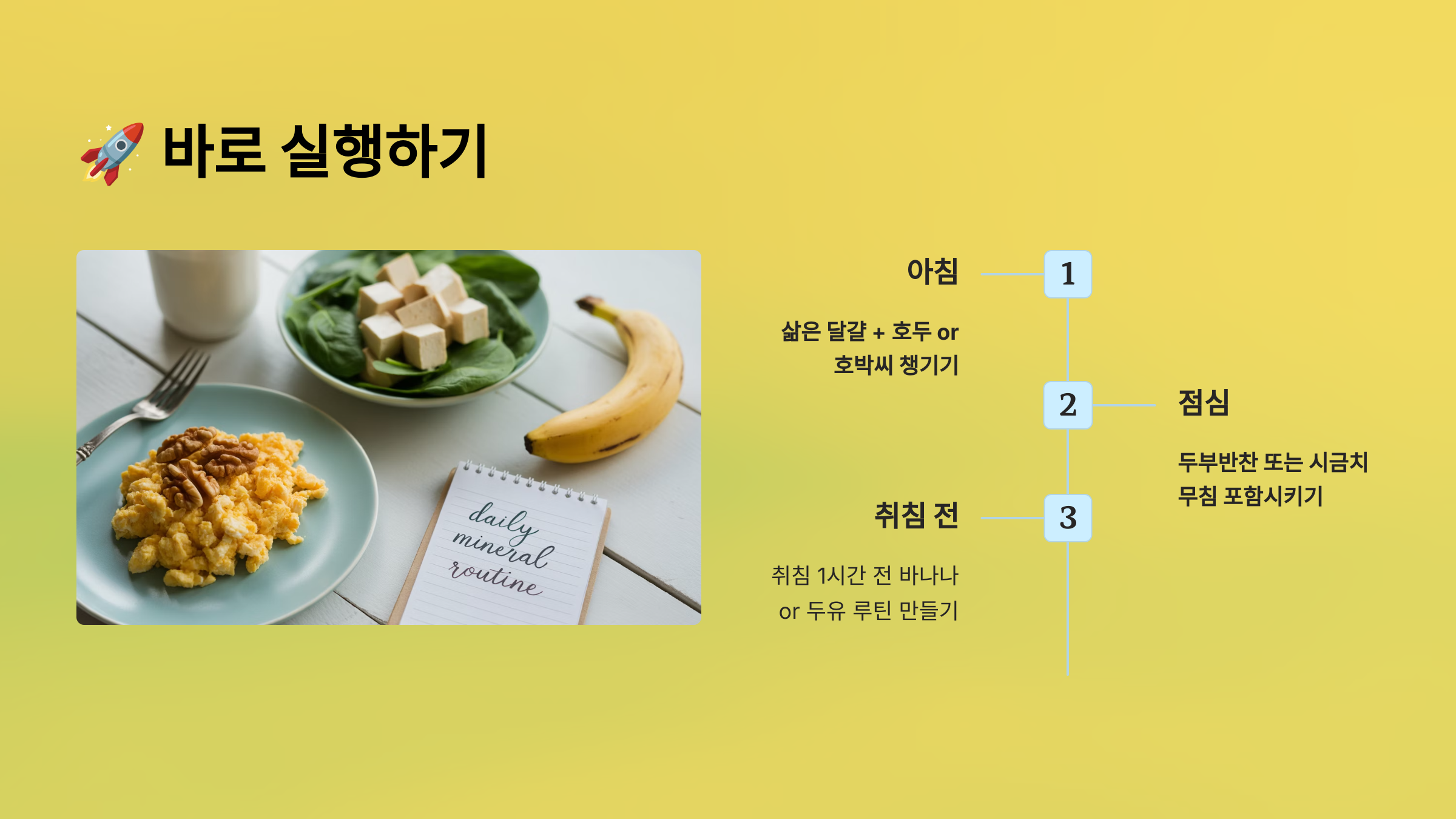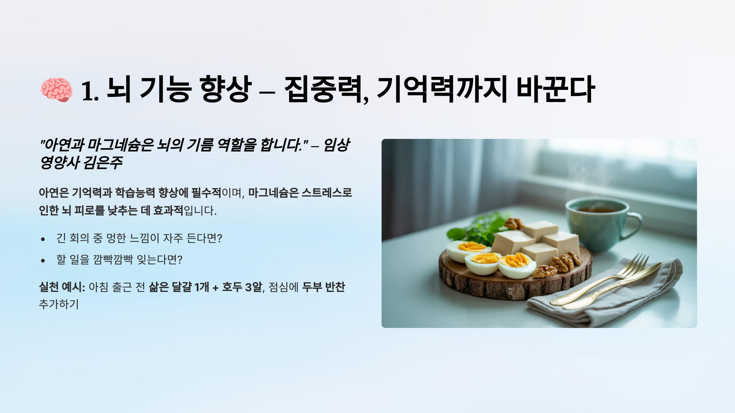> 실천 예시: 아침 출근 전 **삶은 달걀 1개 + 호두 3알**, 점심에 **두부 반찬** 추가하기