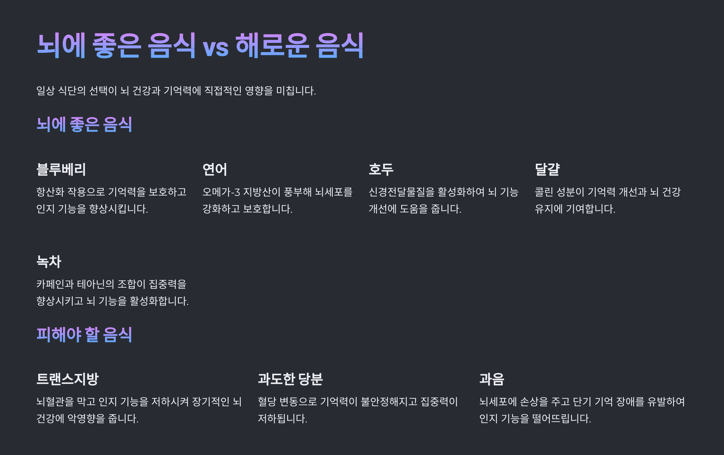 💡 3. 뇌에 좋은 음식 5가지 vs 해로운 음식 3가지