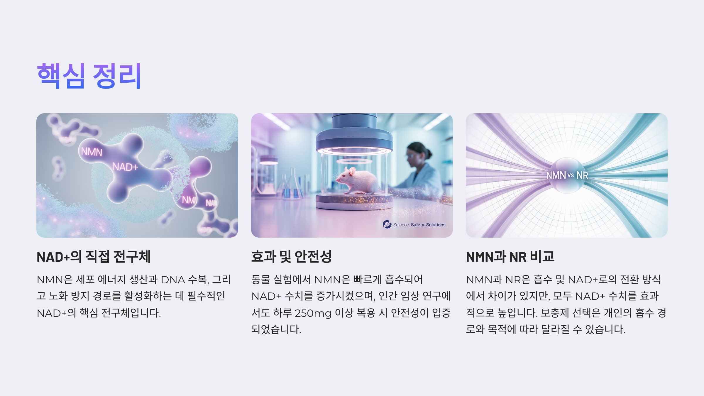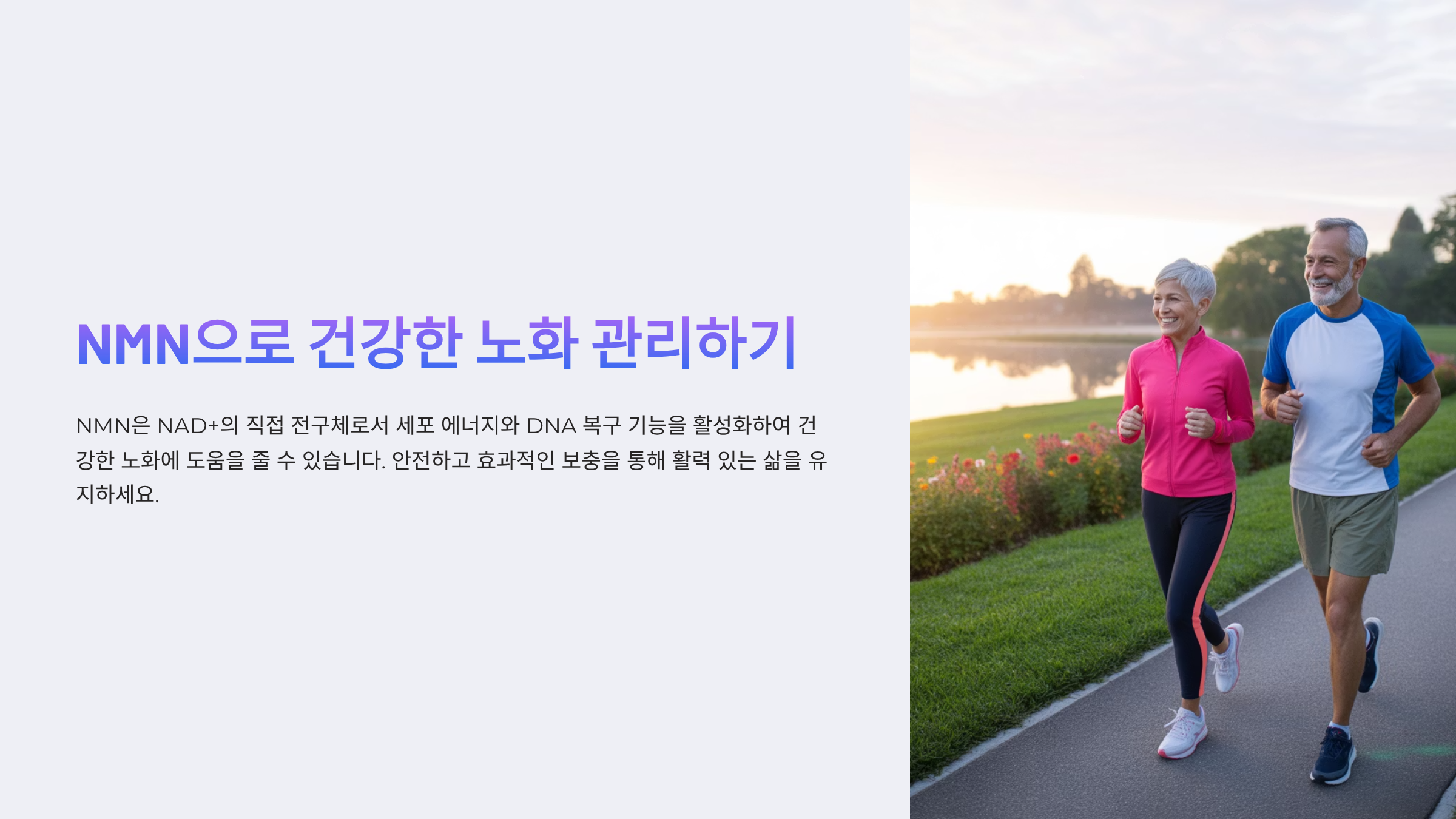 NMN이 무엇인지, 왜 중요한지, NAD+와 어떤 관계가 있는지를 알게 되고, 증명된 기능적 역할을 바로 이해해 적용할 수 있습니다. 특히 에너지 대사와 DNA 복구 과정을 이해하면 건강한 삶을 위한 NMN 활용법을 체계적으로 따라 할 수 있습니다.
