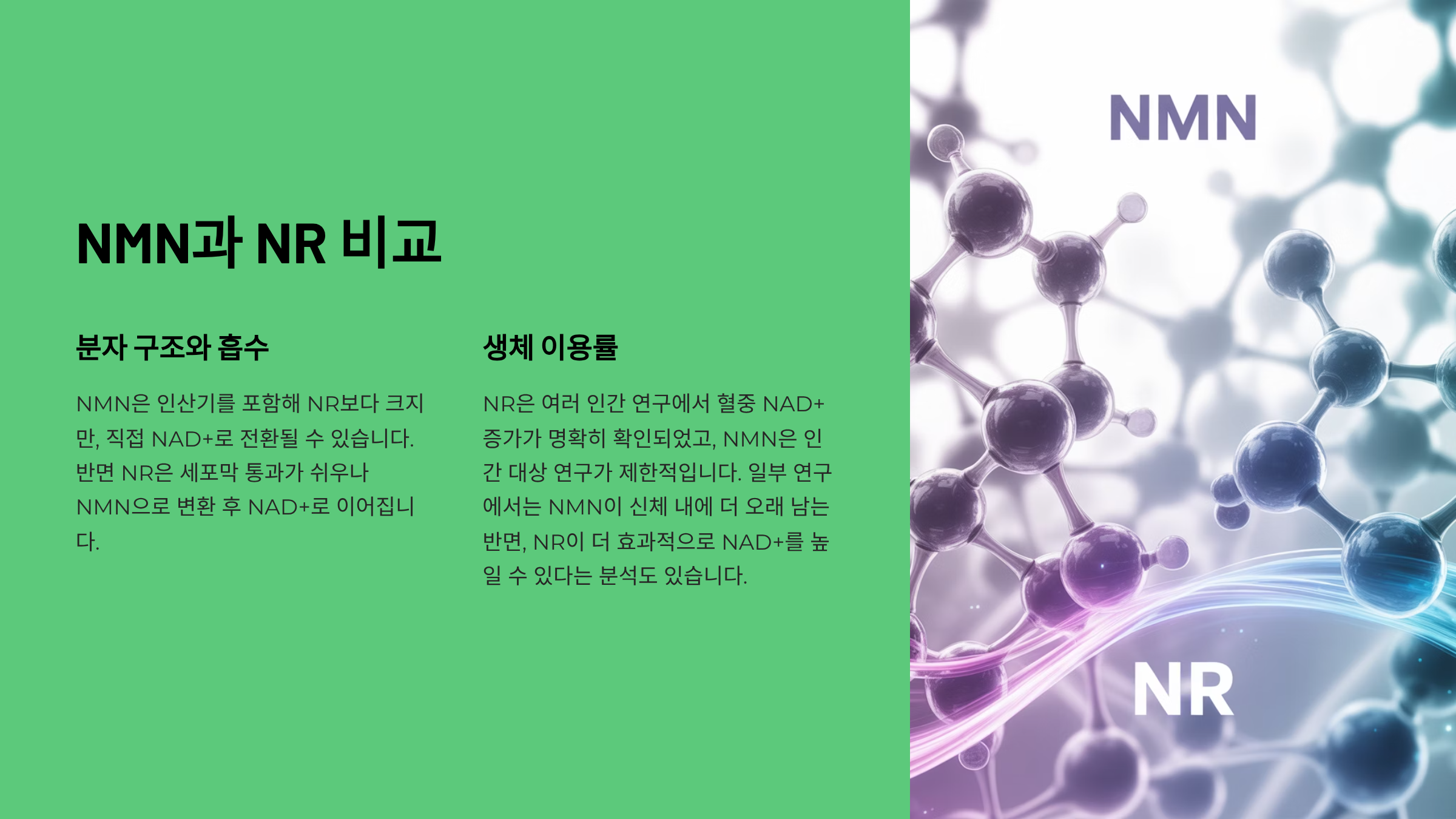 NMN은 인산기를 포함해 NR보다 크지만, 직접 NAD+로 전환될 수 있습니다. 반면 NR은 세포막 통과가 쉬우나 NMN으로 변환 후 NAD+로 이어집니다