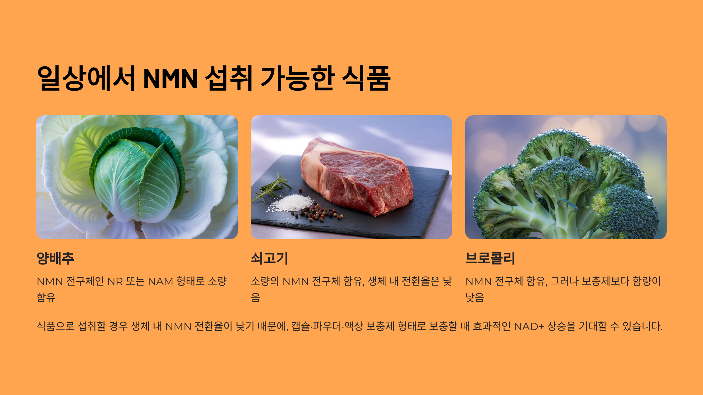 NMN은 소량으로 다양한 식품에 존재하지만, 실질적인 생체 효과를 위한 수준은 어렵습니다. 예를 들어 양배추, 쇠고기, 브로콜리에 NMN 전구체인 NR 또는 NAM 형태로 존재합니다
