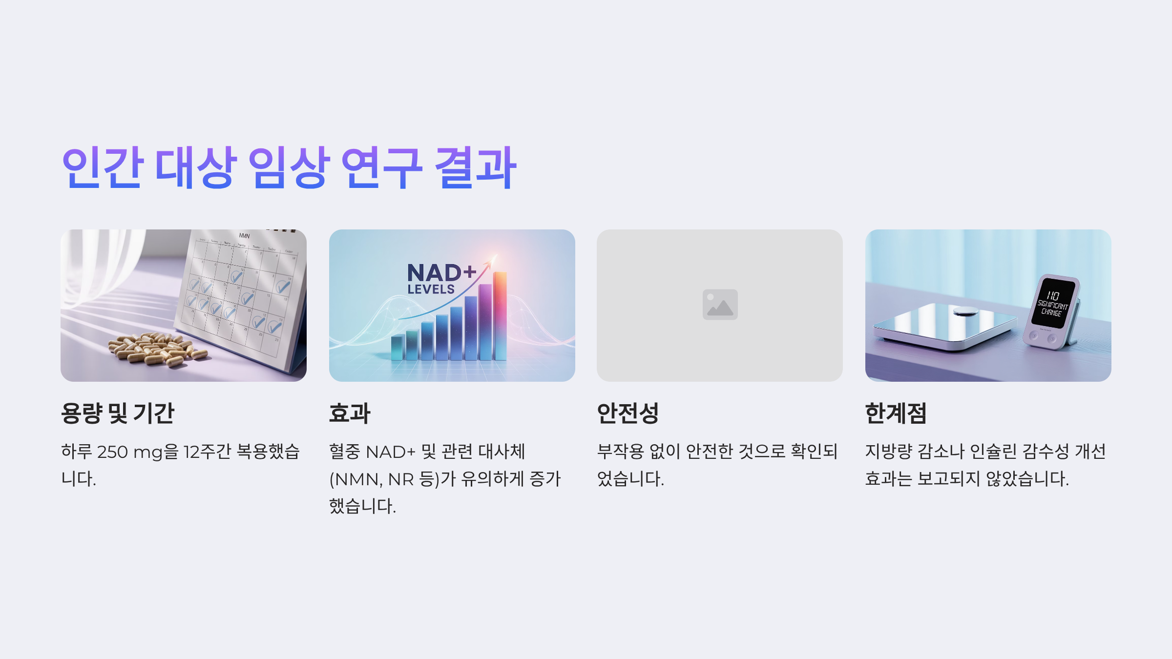 인간 대상 임상에서는 하루 250 mg을 12주간 복용한 결과, 혈중 NAD+ 및 관련 대사체(NMN, NR 등)가 유의하게 증가했으며, 부작용 없이 **안전한 것으로 확인**되었습니다. 그러나 지방량 감소나 인슐린 감수성 개선 효과는 보고되지 않았습니다.