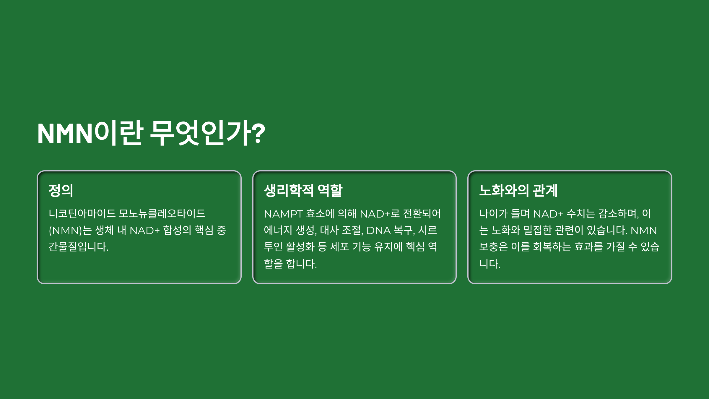 1. NMN은 NAD+의 직접 전구체로, **세포 에너지와 노화 경로 활성화**에 중요하다
