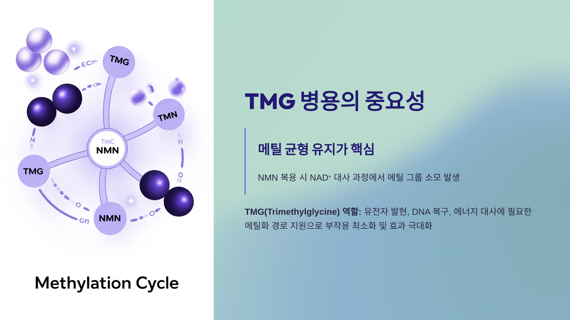 NMN 복용 시 NAD⁺ 대사 과정에서 nicotinamide(NAM) 생성이 증가하면 **메틸 그룹 소모가 일어날 수 있어**, 메틸 공급자 역할을 하는 **TMG 병용이 권장**됩니다. TMG(Trimethylglycine)는 유전자 발현, DNA 복구, 에너지 대사에 필요한 **메틸화 경로를 지원**하며, NMN과 병용 시 **메틸 균형 유지를 통해 부작용 최소화** 및 효과 극대화가 가능합니다. TMG와 NMN을 1:1 비율, 또는 NMN 기준으로 500 mg 수준으로 함께 섭취하는 전략이 실용적입니다.