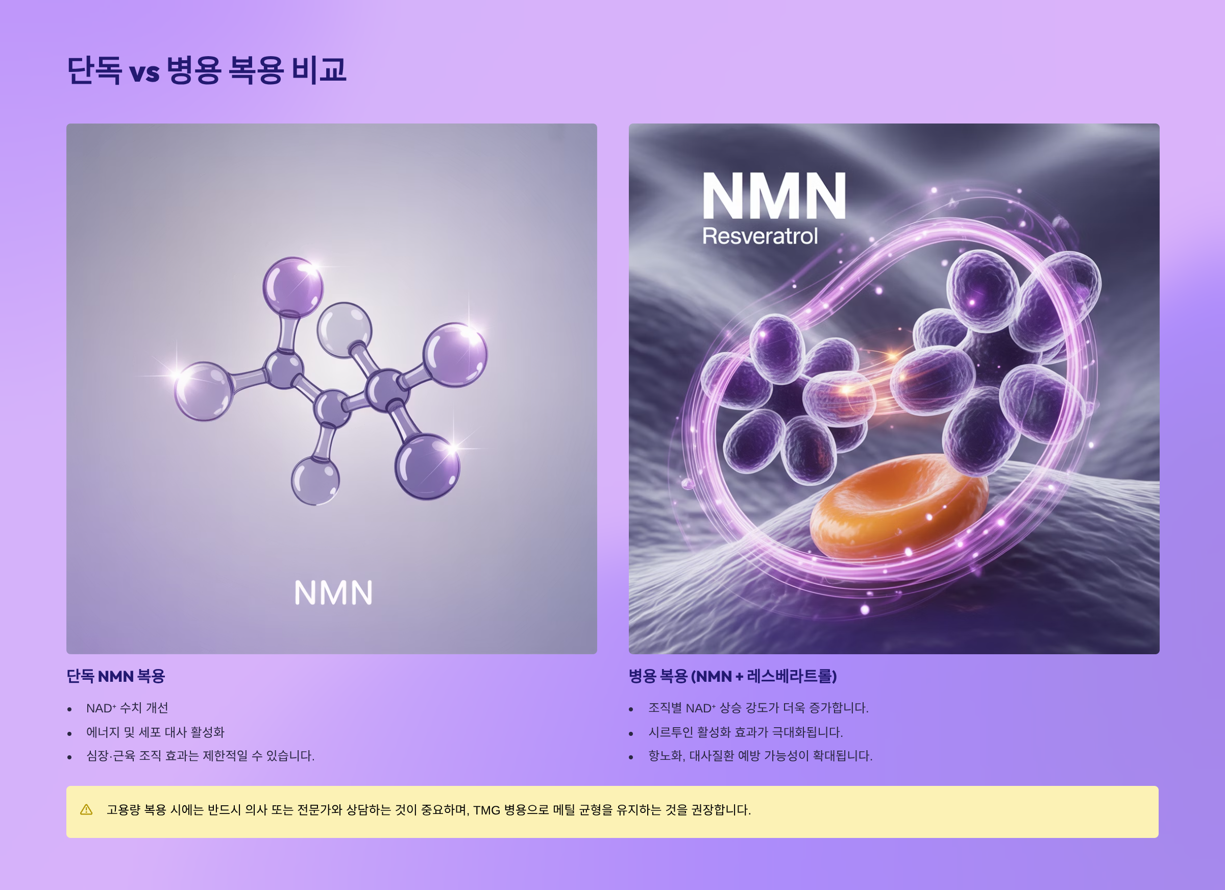 **병용 복용**—특히 레스베라트롤과 함께—은 **조직별 NAD⁺ 상승 강도 증가** 뿐 아니라, 시르투인 활성화 효과도 증가하여 **항노화, 대사질환 예방** 가능성이 더 큽니다. 다만, 메틸 균형 유지가 필요한 경우 **TMG 병용 추천**, 고용량 복용 시 **의사 상담 필요**합니다.