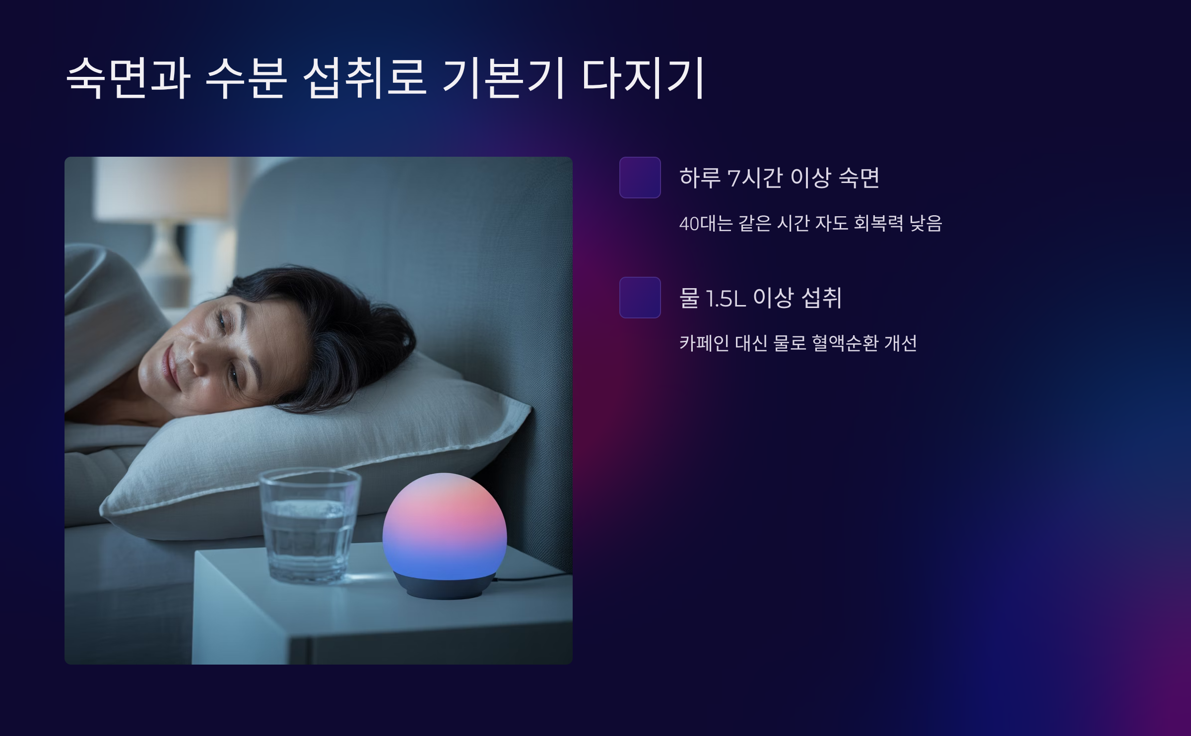40대 이후에는 수면의 질이 떨어지기 쉽기 때문에, 같은 시간 자더라도 회복력이 낮습니다.