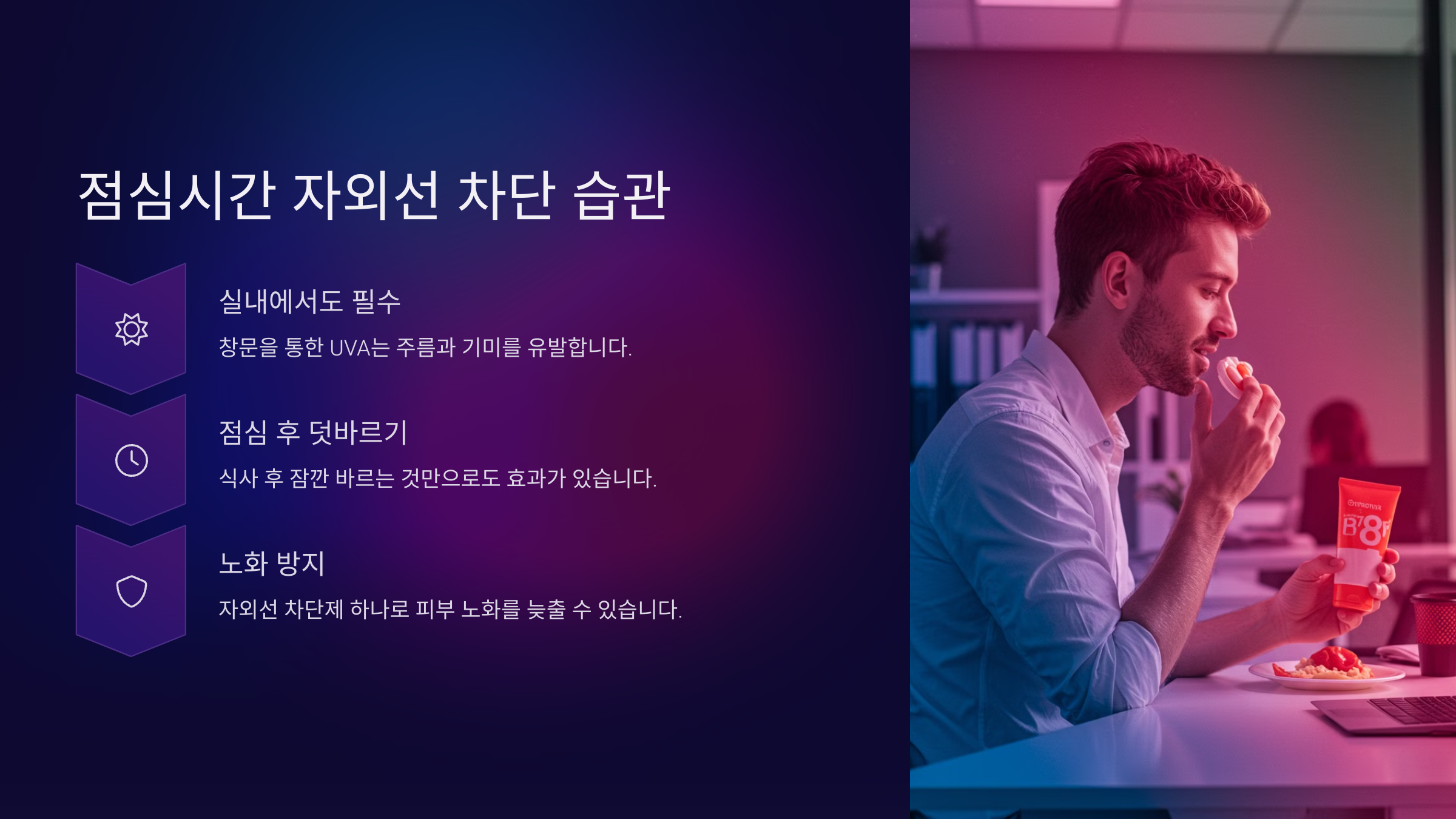 실내 근무자도 자외선 차단제는 필수입니다. 특히 창문을 통한 UVA는 주름과 기미를 유발합니다. 점심식사 후, 잠깐 바르는 자외선 차단제 하나로 피부 노화를 늦출 수 있습니다.