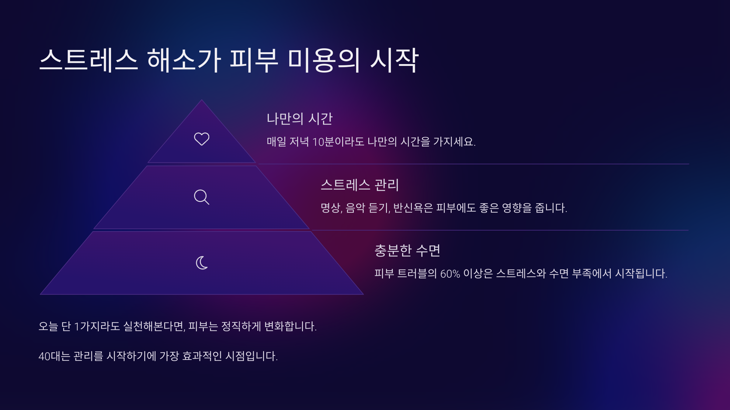 모든 습관을 한꺼번에 바꾸긴 어렵습니다. 하지만 오늘 단 1가지라도 실천해 본다면, 피부는 정직하게 변화합니다. 40대는 늦은 시기가 아니라 관리를 시작하기에 가장 효과적인 시점입니다.