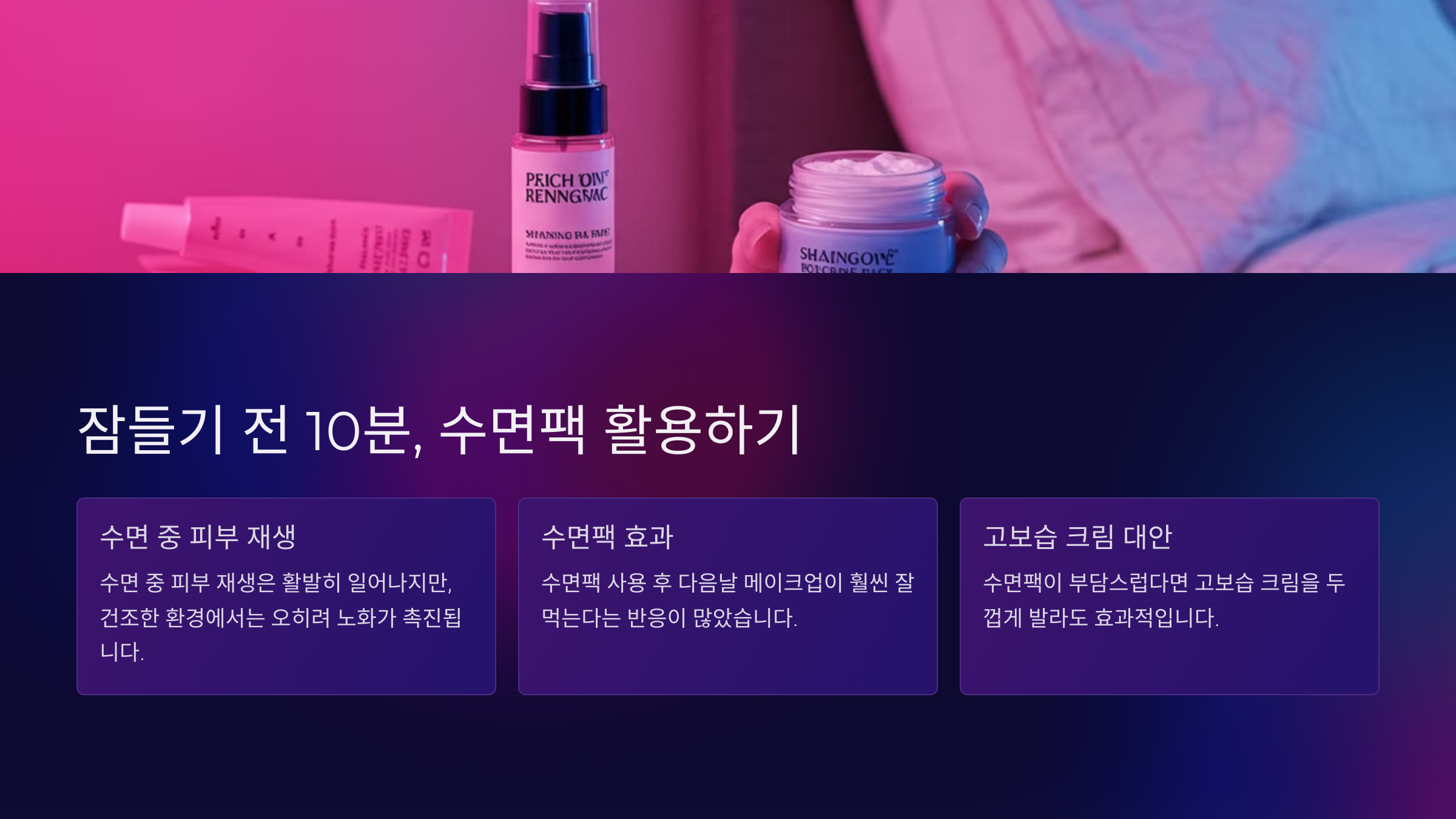 수면 중 피부 재생은 활발히 일어나지만, 건조한 환경에서는 오히려 노화가 촉진됩니다. 수면팩 또는 고보습 크림을 자기 전 루틴에 포함시키면 다음날 피부 컨디션이 달라집니다.