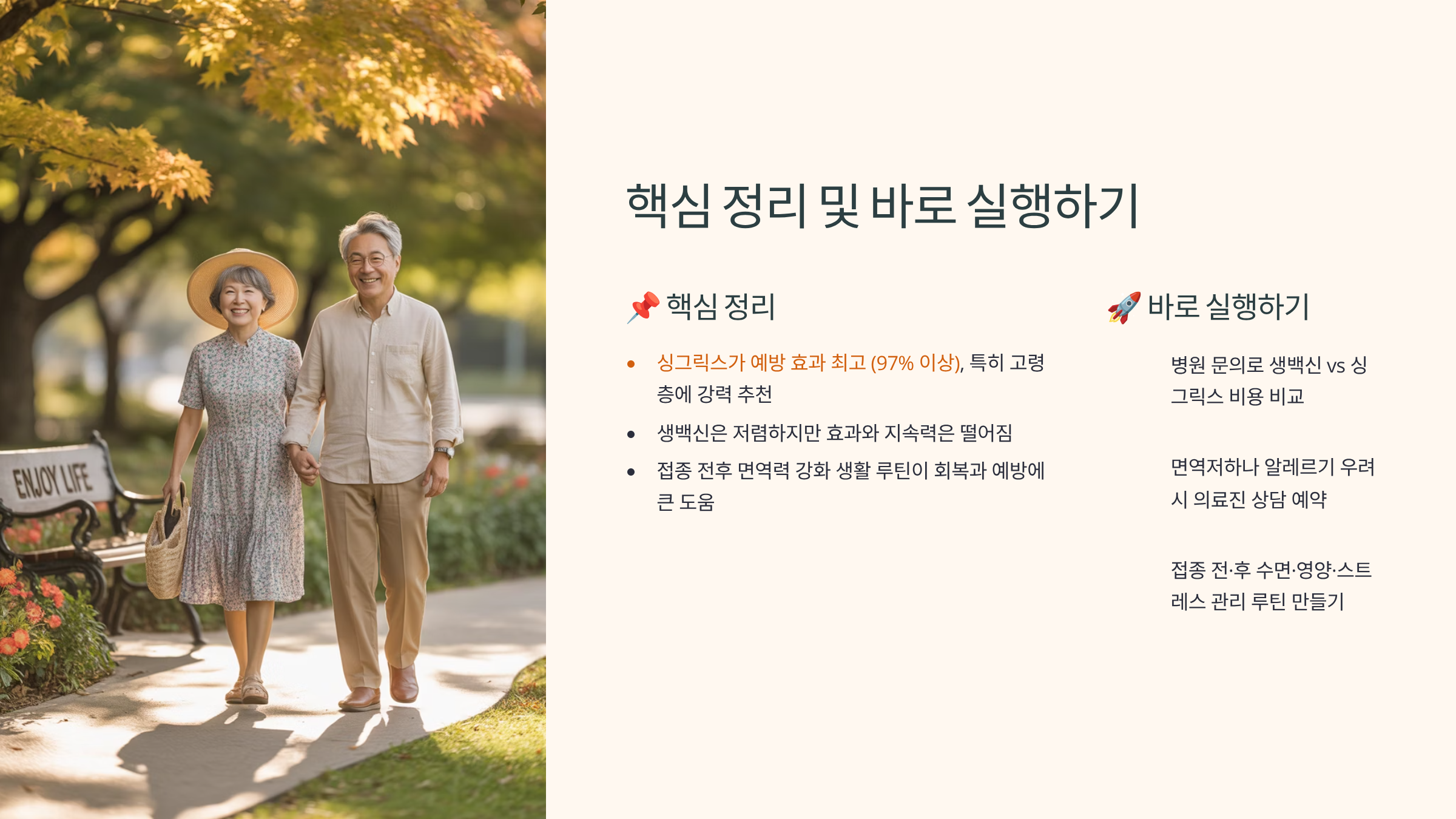 이 글에서 생백신 vs 사백신(싱그릭스)의 차이·효과·비용·접종 시기·부작용·면역 유지 생활팁을 5단계로 정리했습니다.