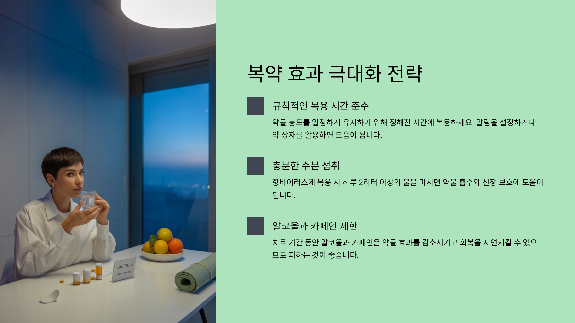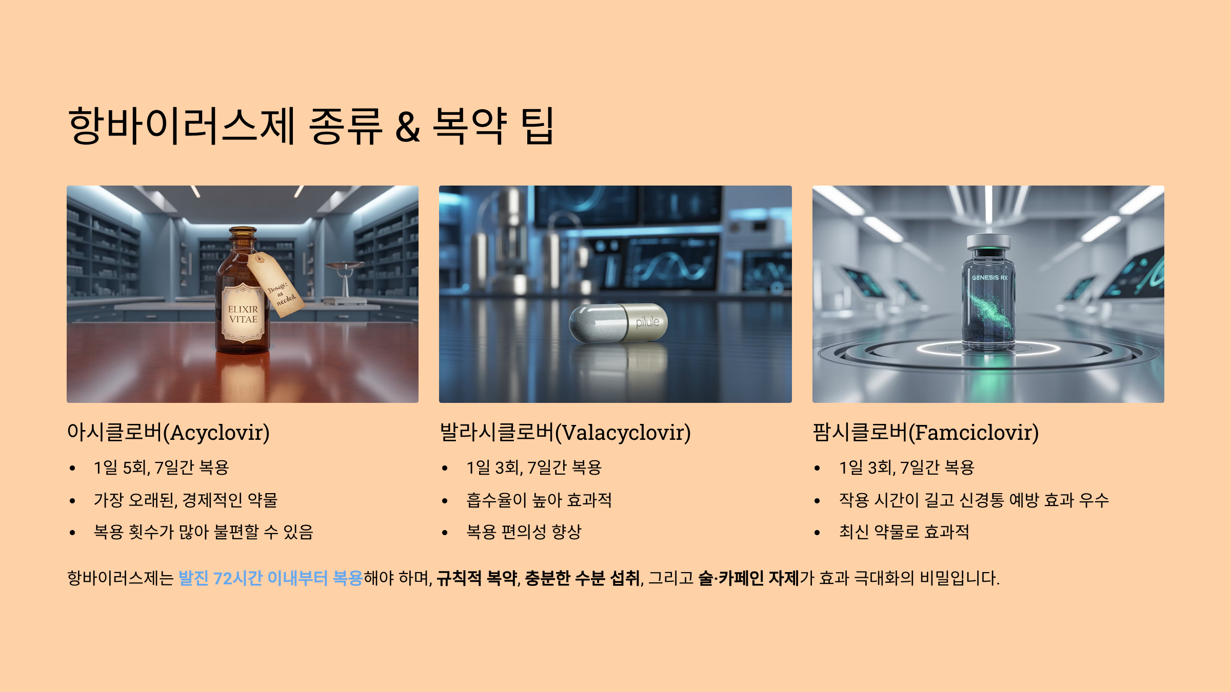 항바이러스제는 **발진 72시간 이내부터 복용**해야 하며, **규칙적 복약**, **충분한 수분 섭취**, 그리고 **술·카페인 자제**가 효과 극대화의 비밀입니다.